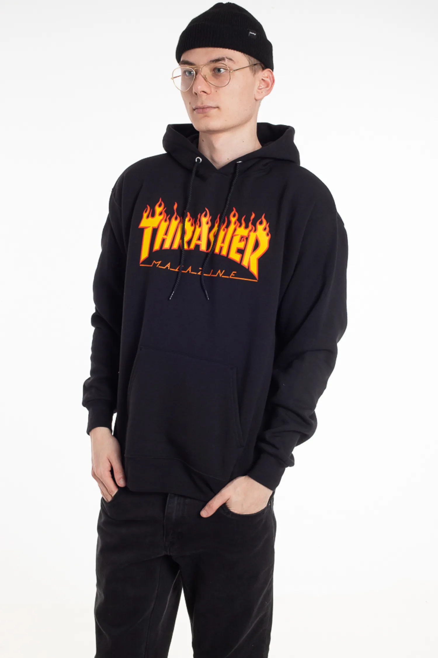Bluza z kapturem Thrasher, z nadrukiem na przodzie, w kolorze czarnym.