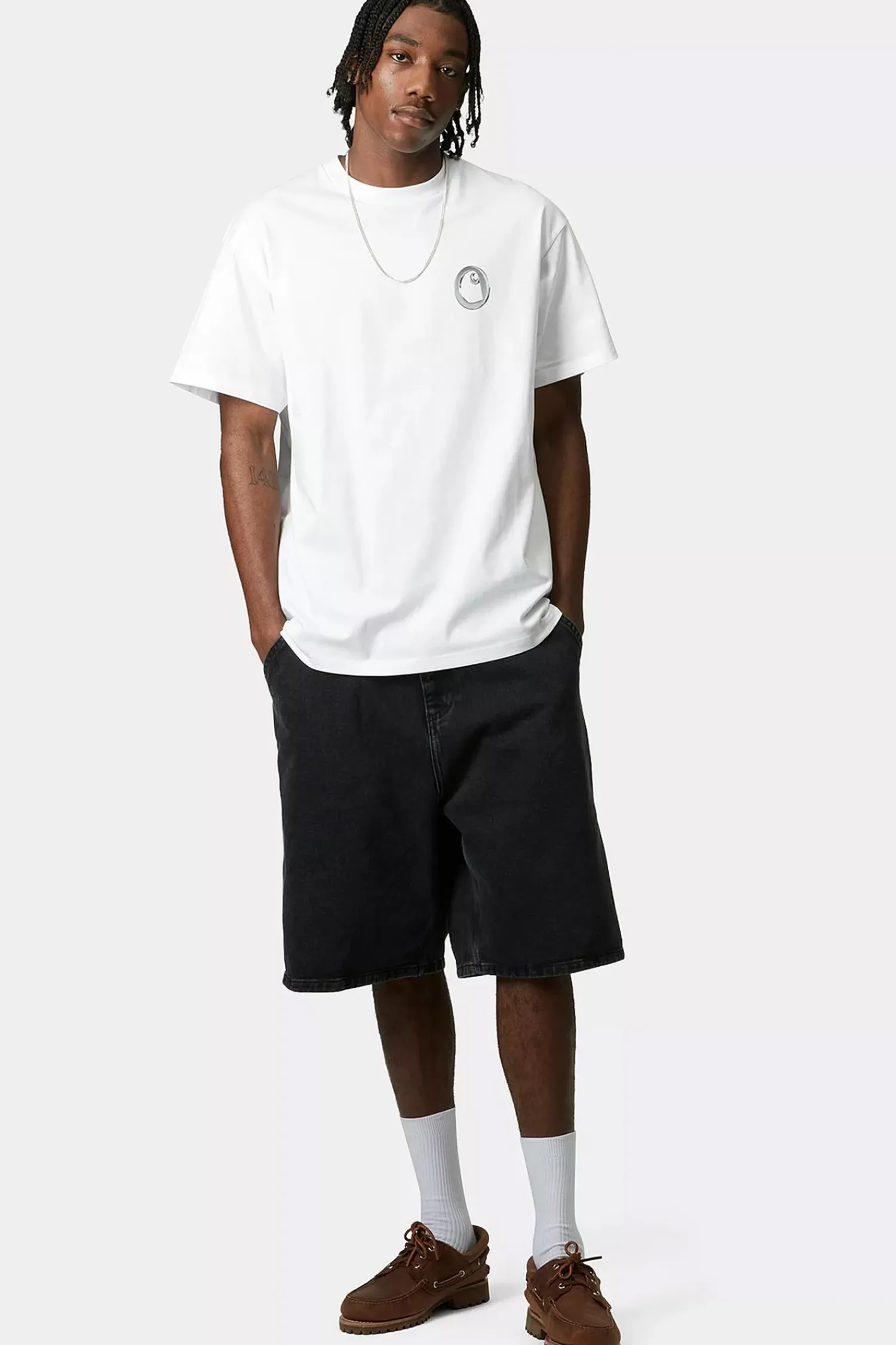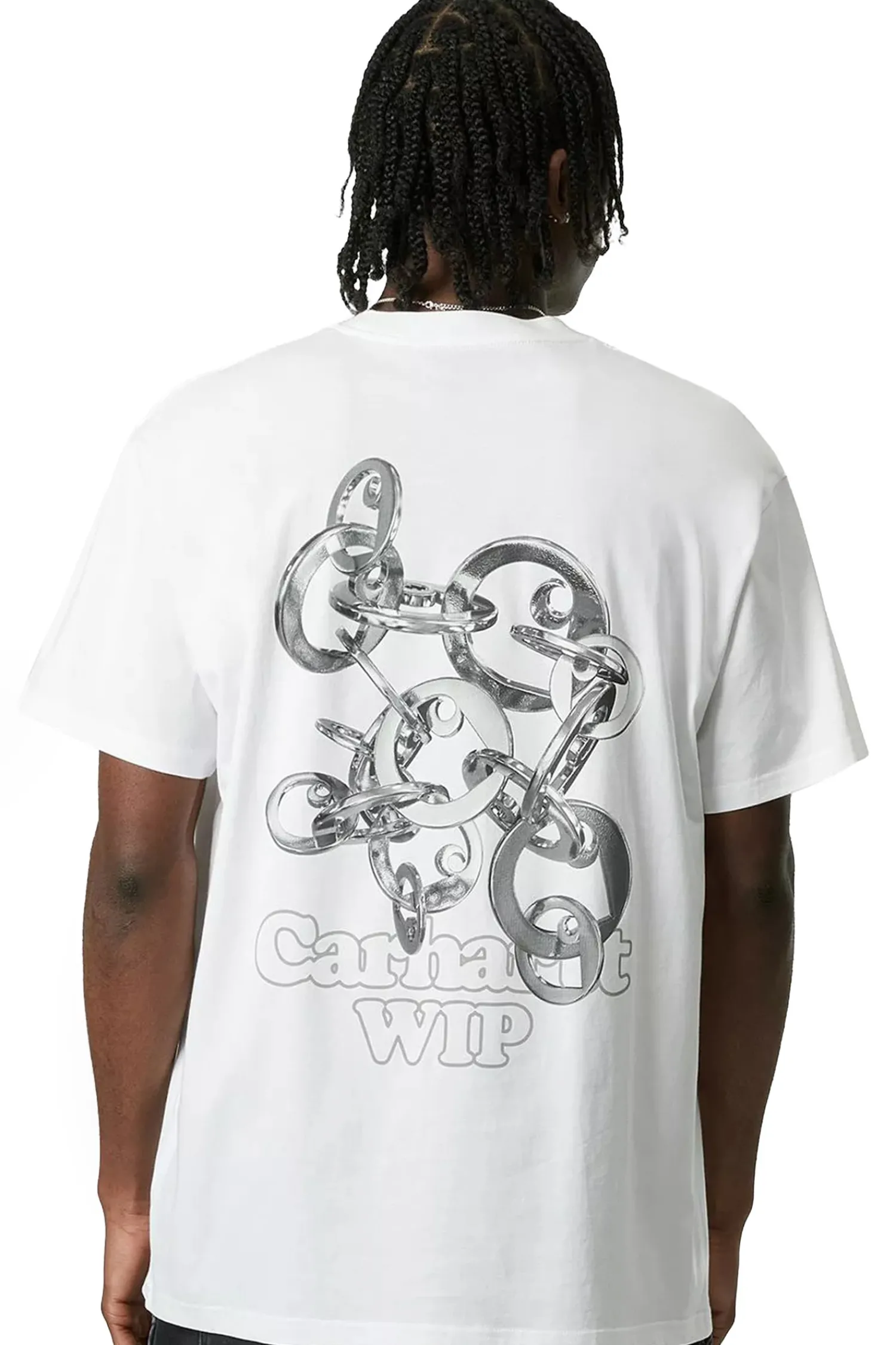 Koszulka Carhartt WIP Linked Charms White Silver I034410-0YFXX to połączenie minimalistycznego stylu i wyrazistej grafiki inspirowanej industrialnym designem. Na plecach widnieje unikalny nadruk przedstawiający splątane metalowe ogniwa, nadające całości surowego, futurystycznego charakteru. Wykonana z wysokiej jakości bawełny, gwarantuje komfort noszenia i trwałość, idealnie wpisując się w estetykę streetwearu.