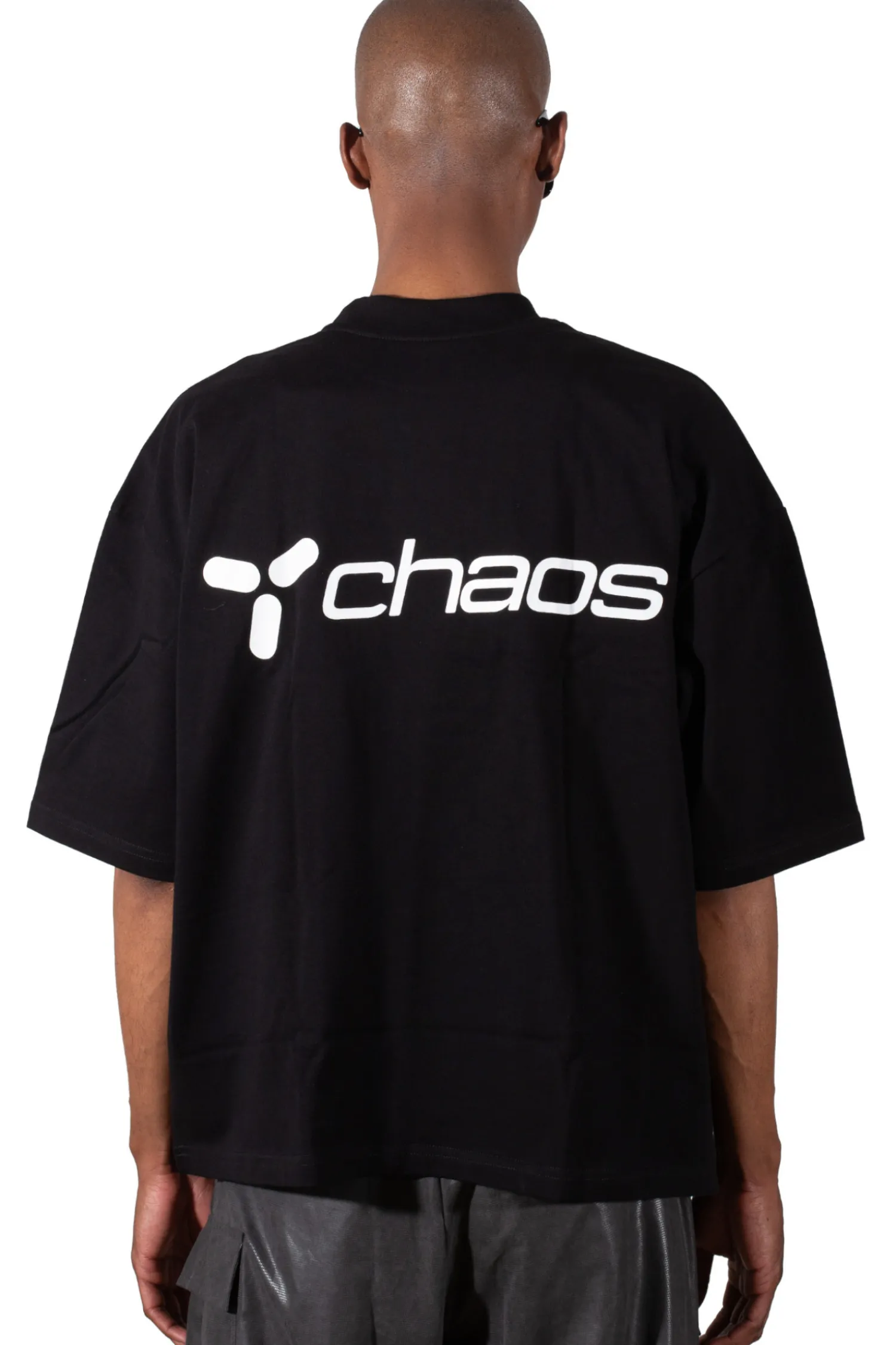 Koszulka t-shirt Chaos, w kolorze czarnym z kontrastowymi nadrukami na przodzie oraz tyle, w krótszym ale szerszym kroju.