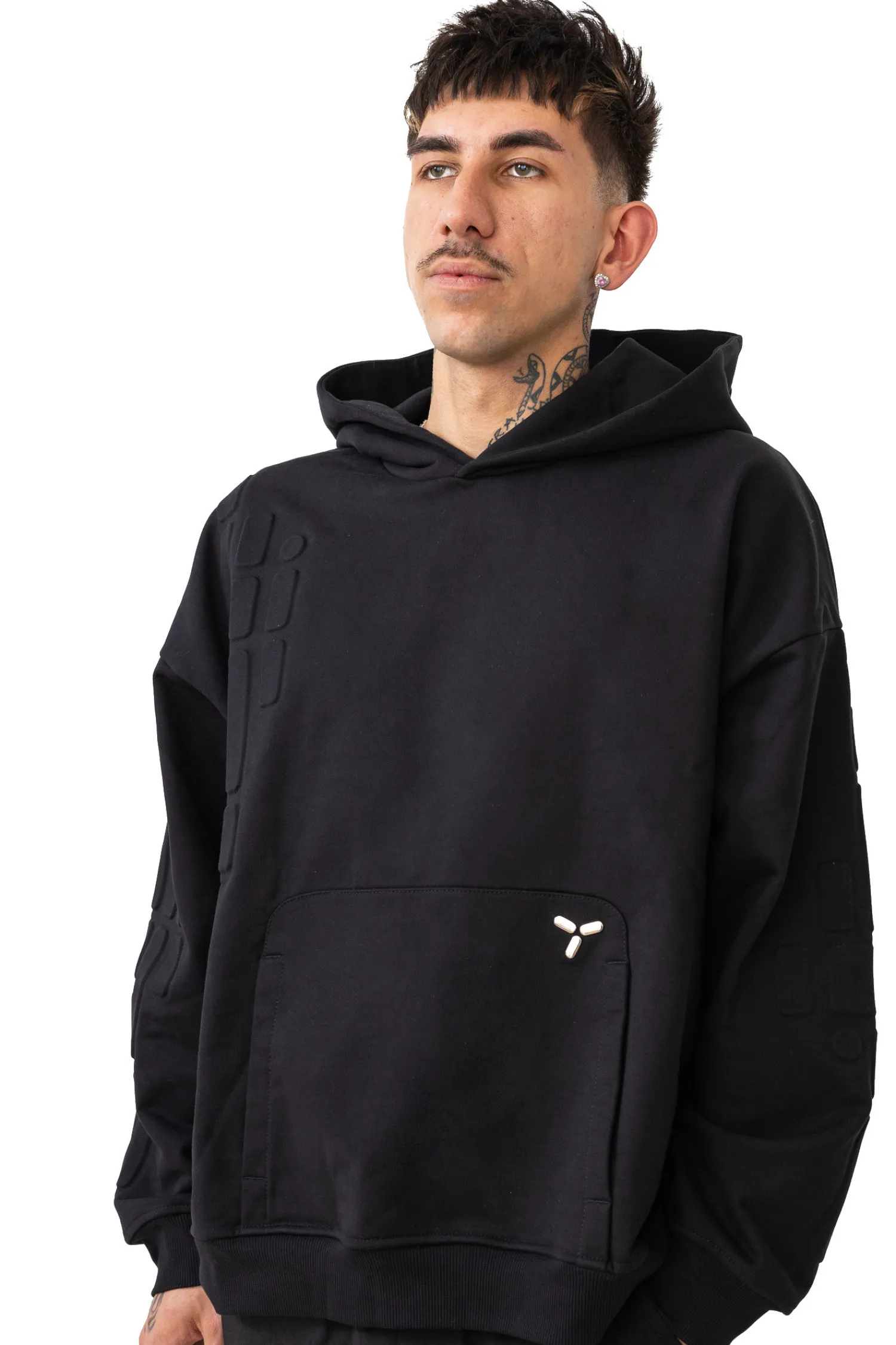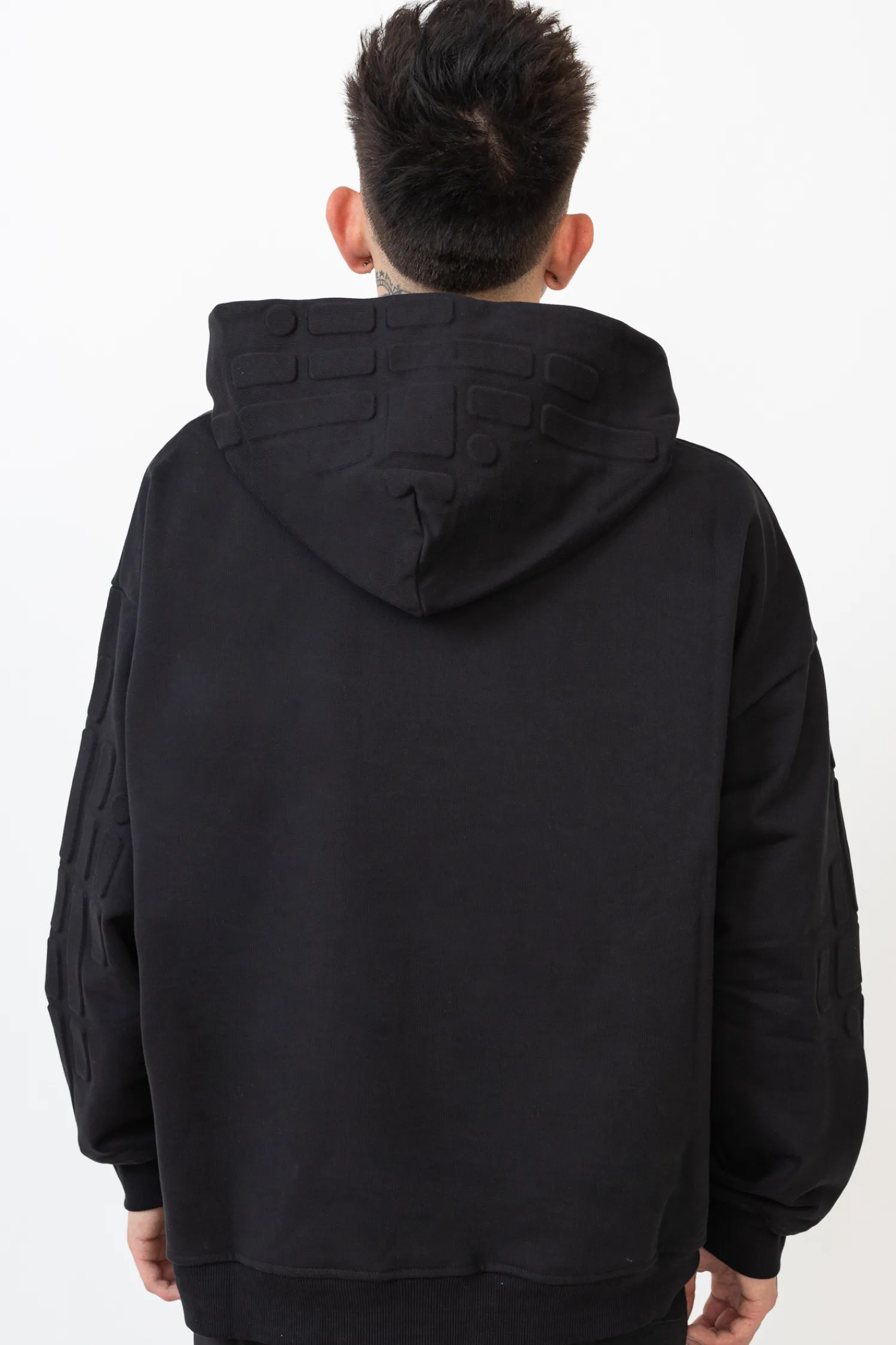 Bluza z kapturem Chaos Embossed Black to ponadczasowy dodatek do każdej garderoby, łączący subtelną estetykę z nowoczesnym designem. Charakteryzuje się ona wysokiej jakości czarnym materiałem, który jest jednocześnie wytrzymały i miękki w dotyku, co zapewnia komfort użytkowania. Na bluzie został wytłoczony unikatowy wzór, który dodaje elegancji i modernistycznego stylu. Dyskretny, ale wyrazisty detal w formie logotypu Chaos umieszczony jest na kieszeni typu kangurka, nadając bluzie charakterystycznego akcentu. Bluza jest zaprojektowana z myślą o wszechstronnym użytkowaniu, posiada praktyczny kaptur, który gwarantuje ochronę przed zimnem oraz dodaje stylu miejskiego looku. Ściągacze na mankietach i na dole bluzy zapewniają idealne dopasowanie i zatrzymują ciepło. Prosty, ale efektowny design sprawia, że bluza doskonale sprawdzi się zarówno jako element codziennego ubioru, jak i bardziej wyrafinowanej stylizacji. Idealnie pasuje do wielu rodzajów odzieży, od casualowych jeansów po sportowe spodnie dresowe.