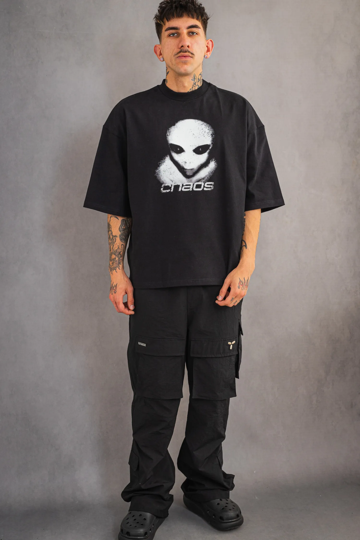 Zainspiruj się niepowtarzalnym stylem koszulki T-shirt Chaos Alien Distressed Black, która emanuje indywidualnością. Wyrazisty motyw obcego stworzenia wprowadzi do Twojego looku dawkę tajemniczości i ekstrawagancji. Ciesz się doskonałym komfortem noszenia dzięki miękkiej i przyjemnej w dotyku tkaninie. Ta koszulka to nie tylko wyrazisty design, ale także wygoda na co dzień.