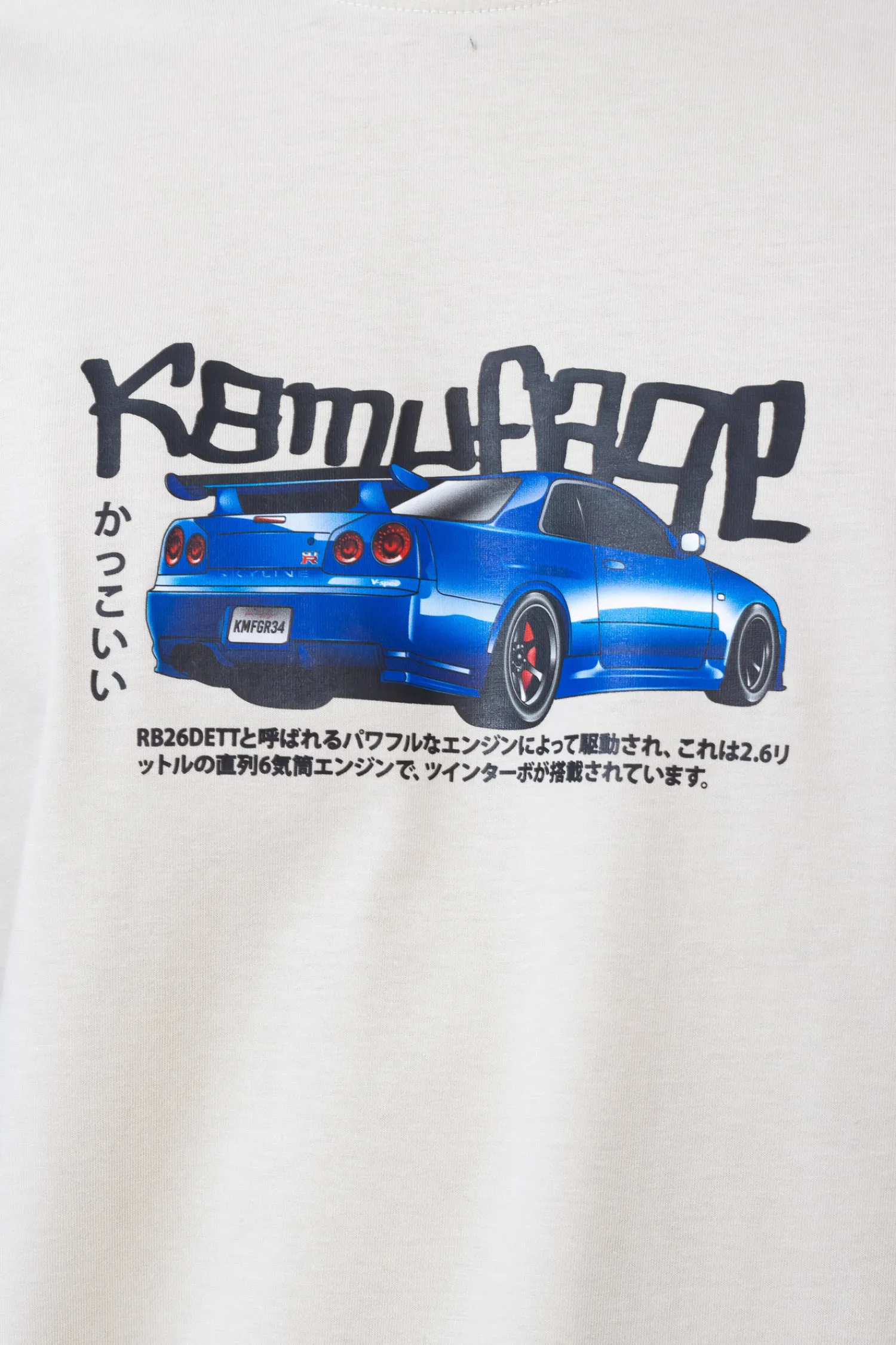 Koszulka 'Kamufllage R34 Beige’ to kwintesencja połączenia pasji motoryzacyjnej z miejskim stylem. Na beżowym tle tej męskiej koszulki króluje nadruk ikonicznego, niebieskiego samochodu sportowego, co nadaje koszulce dynamiczny i nowoczesny charakter. Nadrukowane logo 'Kamufllage’ w stylu graffiti oraz japońskie znaki poniżej pojazdu podkreślają inspiracje subkulturą tuningową. Wykonanie z wysokiej jakości bawełny zapewnia komfort noszenia, a beżowy kolor koszulki stanowi doskonałą bazę pod casualowe i streetwearowe stylizacje. To propozycja dla mężczyzn, którzy chcą wyrazić swoją osobowość i zamiłowanie do szybkich aut, nie rezygnując z komfortu i stylu.