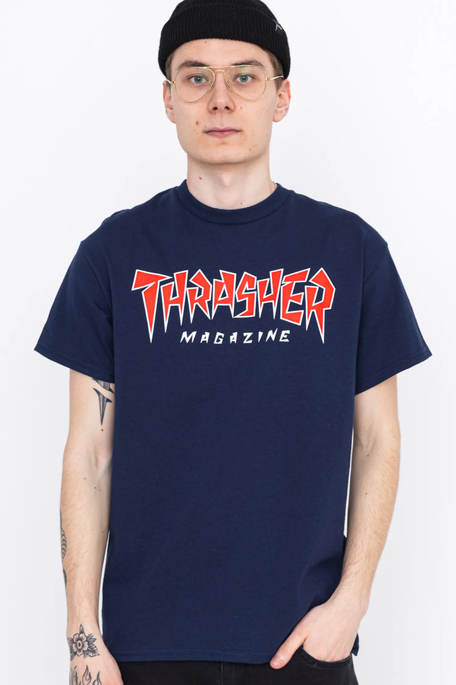 Koszulka Thrasher, w kolorze granatowym, z nadrukiem na przodzie.