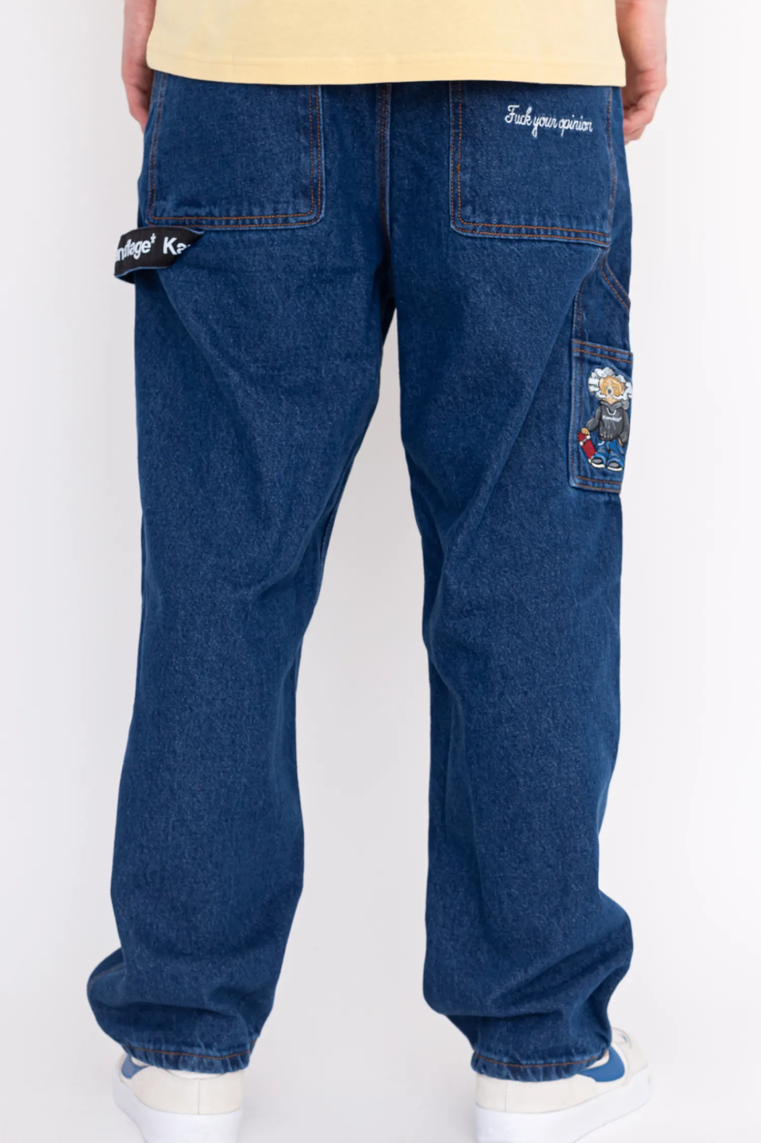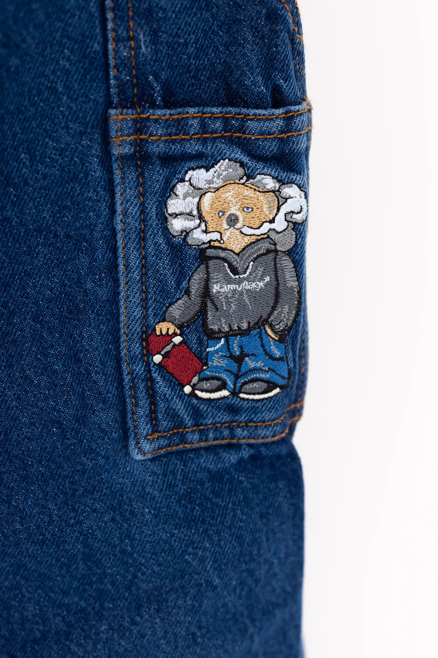 Spodnie jeansowe Kamuflage, zapinane na guzik i zamek z widocznym haftem na tyle.