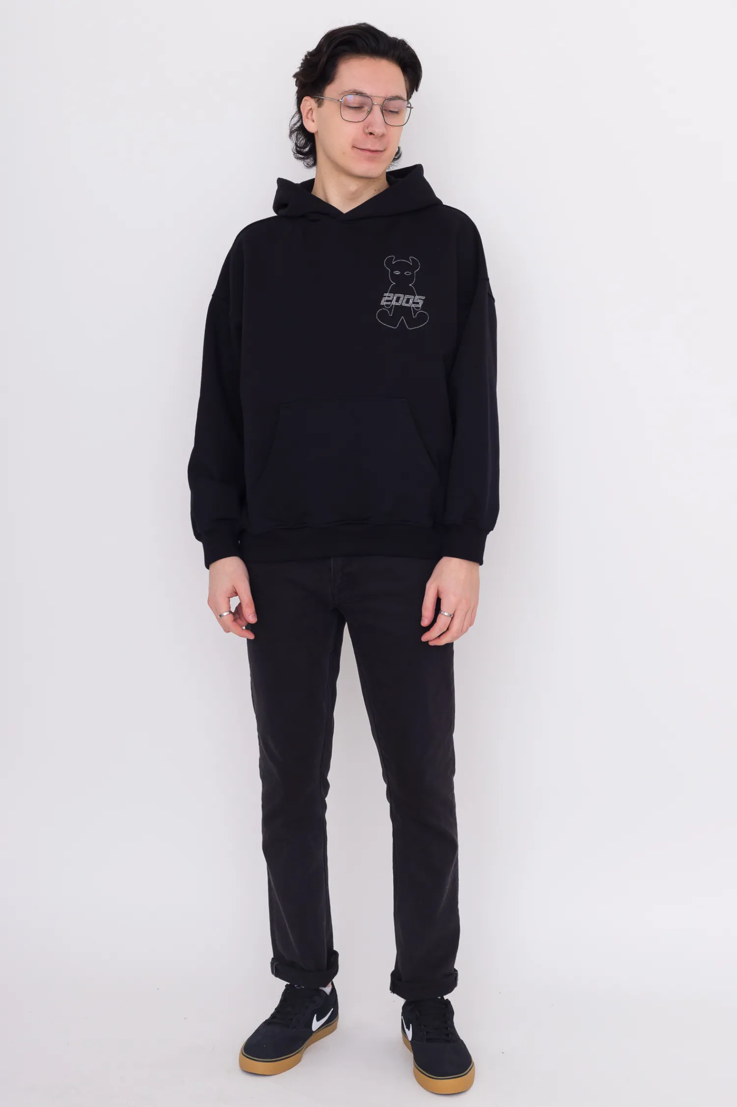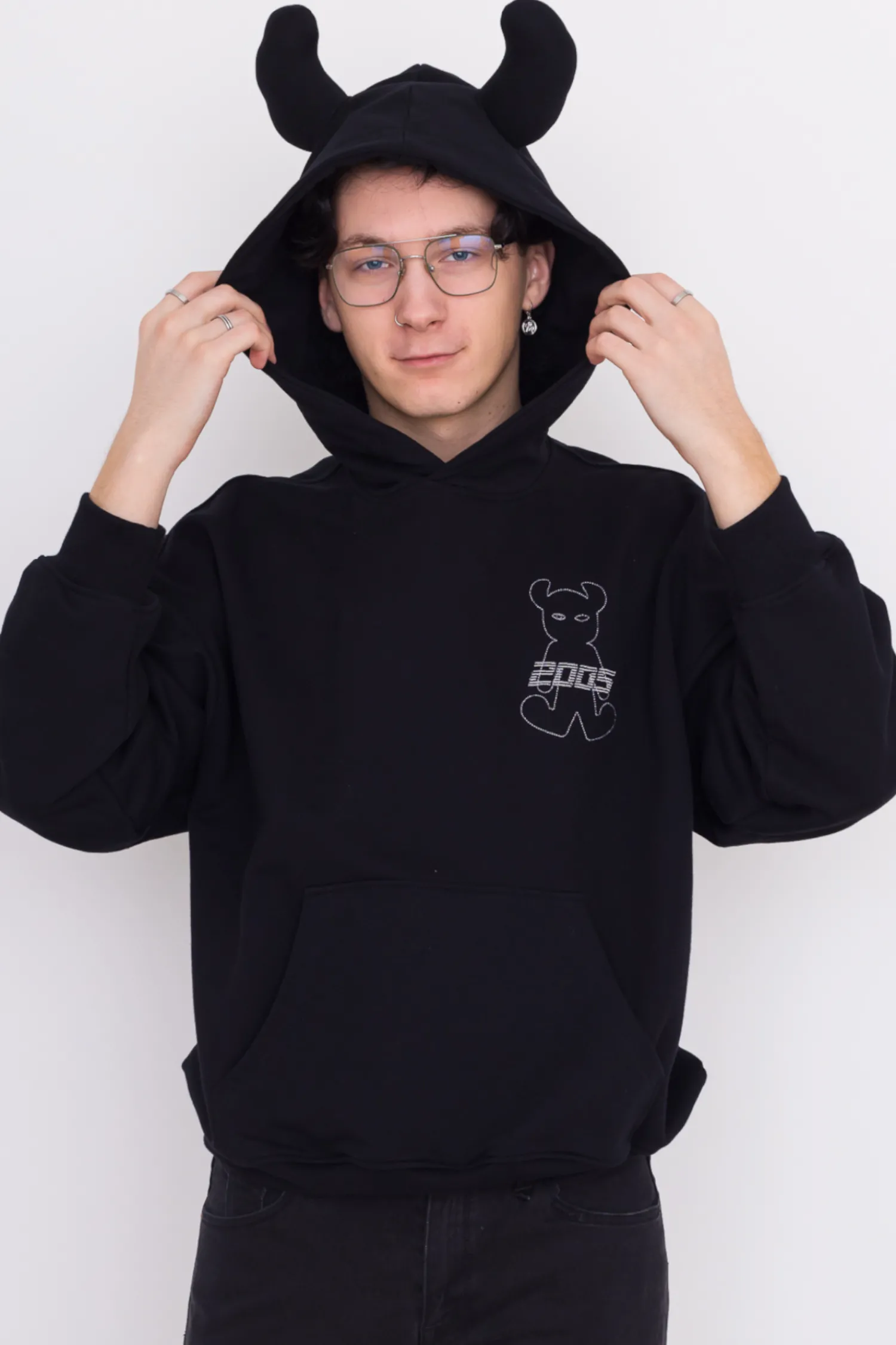 Bluza 2005 z kapturem, haftem na przodzie i ręcznie wykonanymi rogami na kapturze, w kolorze czarny.