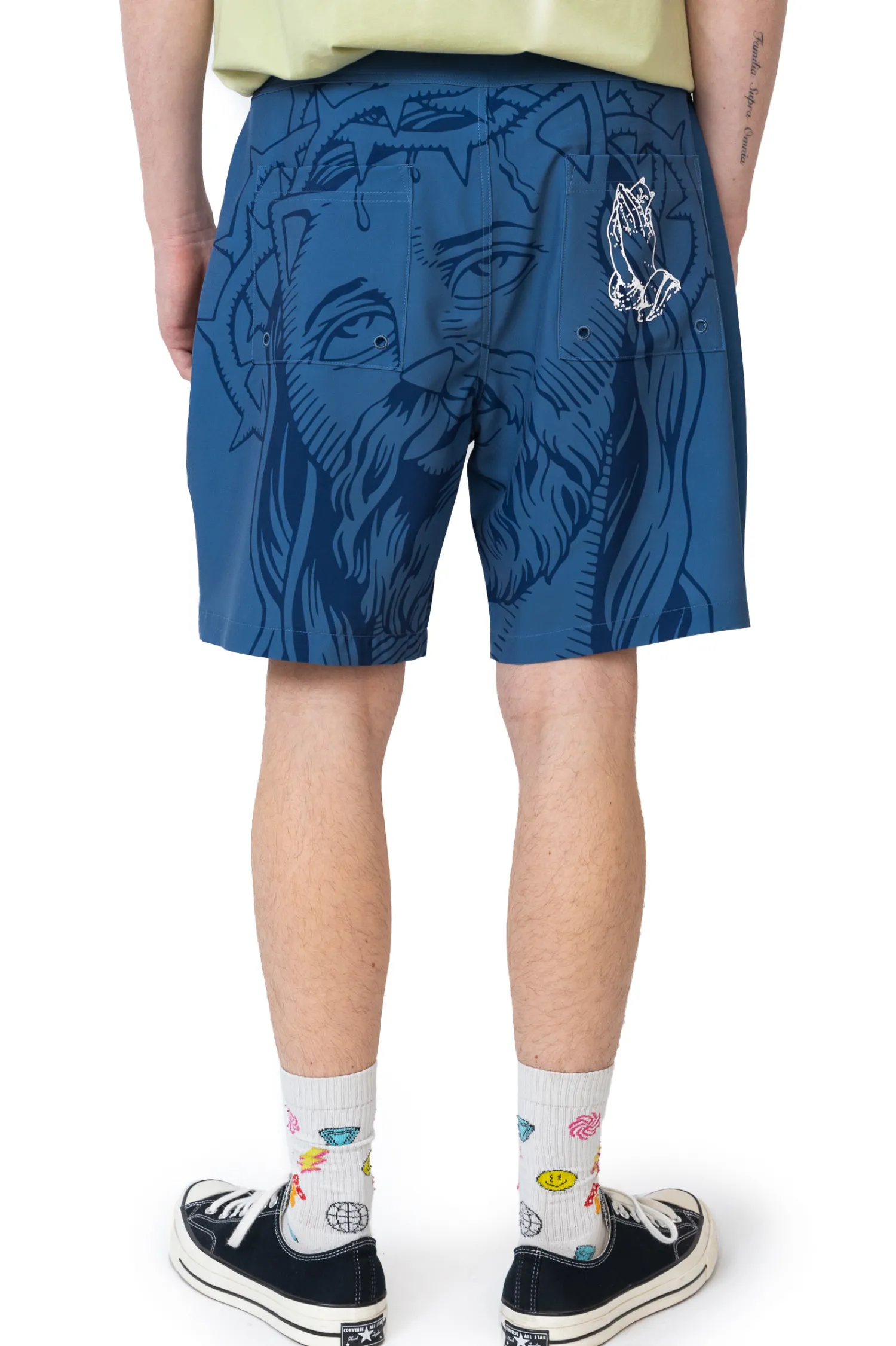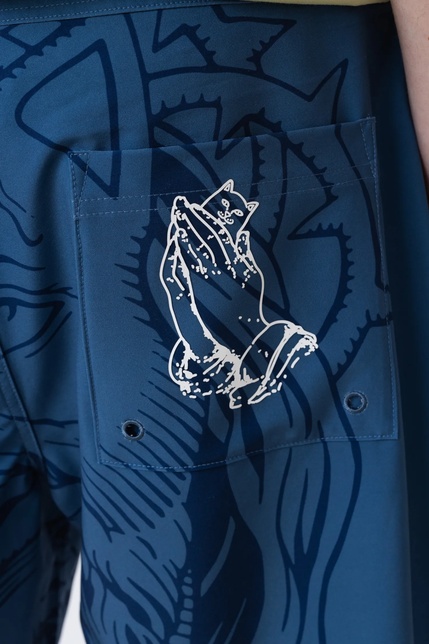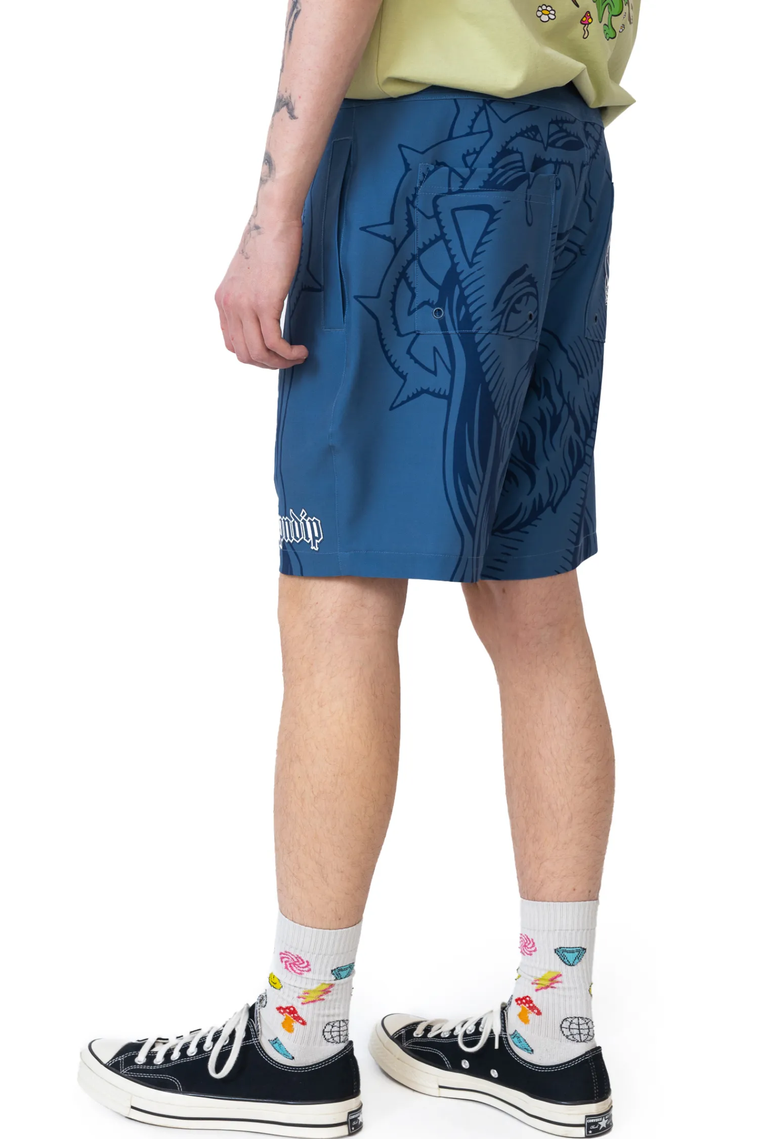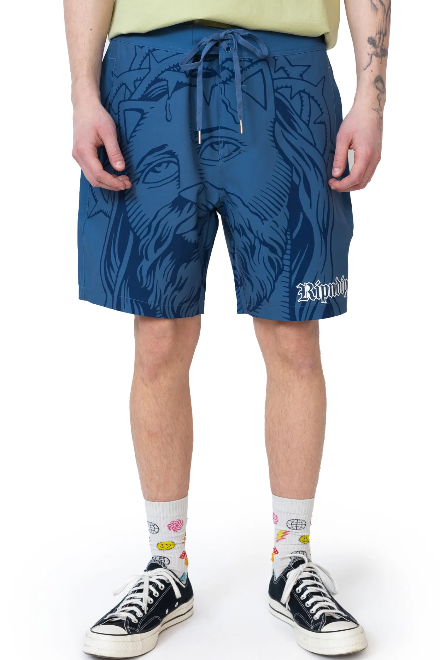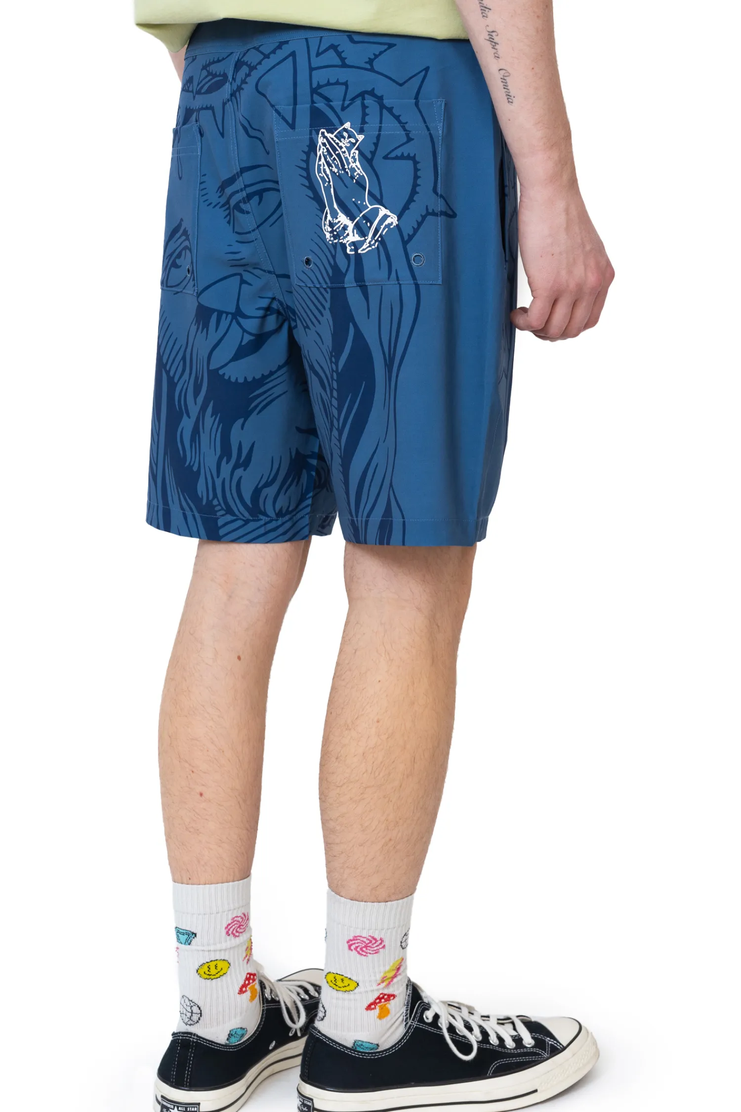Boardshorty Ripndip Lord Savior Navy RNDSPR25127 to odważny element letniej garderoby, ozdobiony charakterystycznym nadrukiem przedstawiającym ikonograficzną interpretację kota Lorda Nermala. Wykonane z lekkiego, szybkoschnącego materiału, zapewniają wygodę i funkcjonalność zarówno podczas aktywności w wodzie, jak i w codziennych stylizacjach streetwearowych.