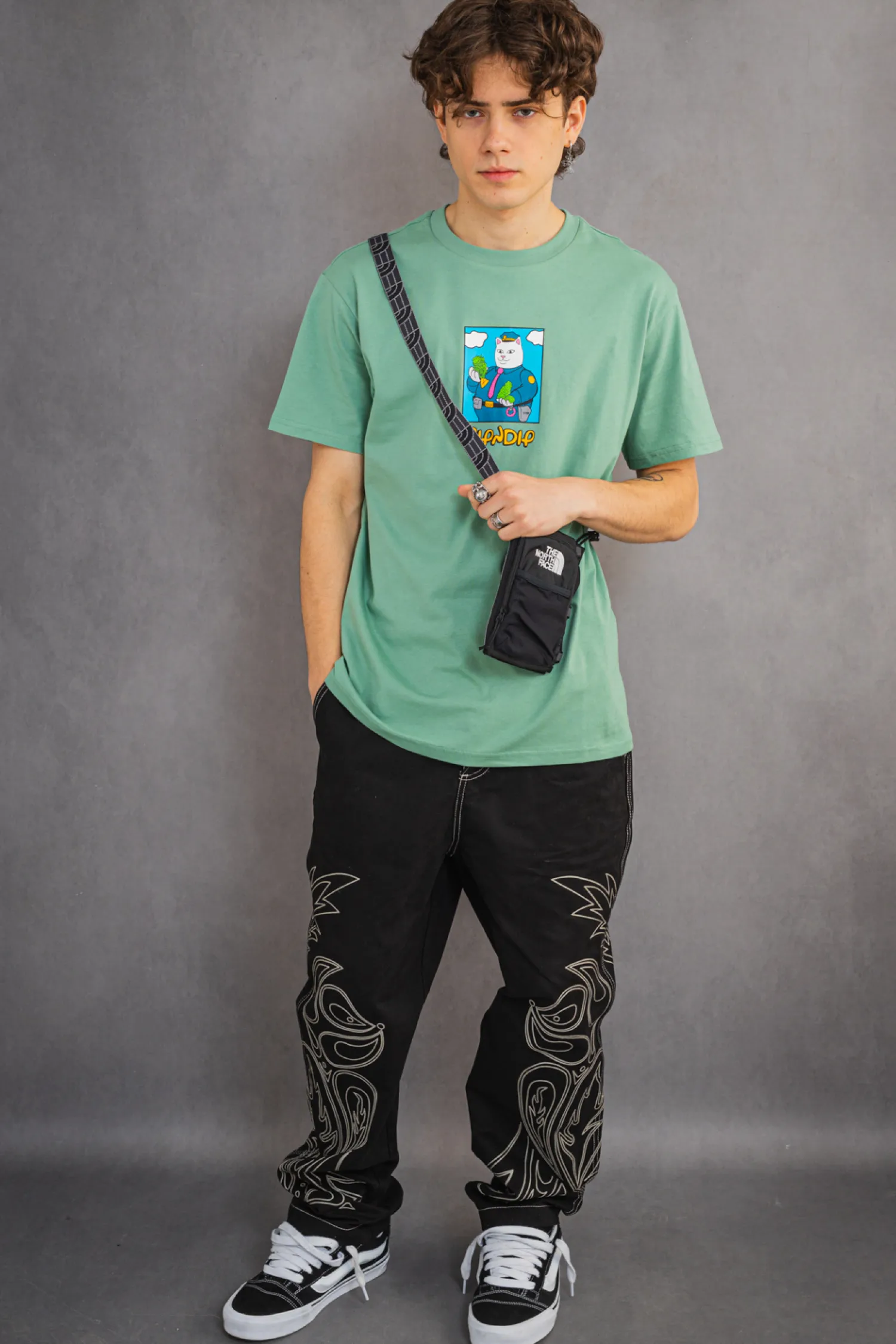 Koszulka Ripndip Confiscated Pine RNDSPR24168 w odcieniu orzeźwiającej mięty przyciąga wzrok wyjątkowym nadrukiem przedstawiąjącym kota Ripndip, ubranego w policyjny mundur, co nadaje jej humorystycznego charakteru. Wykonana z miękkiej, przewiewnej bawełny zapewnia wygodę i komfort noszenia na co dzień. Jej niepowtarzalny design zdecydowanie wyróżni Cię w miejskiej dżungli, a trwały nadruk utrzyma swój wygląd nawet po wielokrotnym praniu. Doskonała dla tych, którzy chcą dodać odrobinę humoru do swojego codziennego looku.