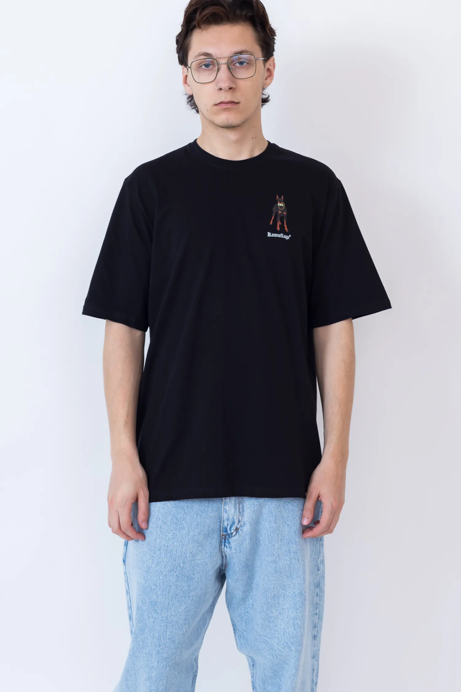T-shirt Kamuflage, w kolorze czarnym, z nadrukiem na przodzie i tyle.