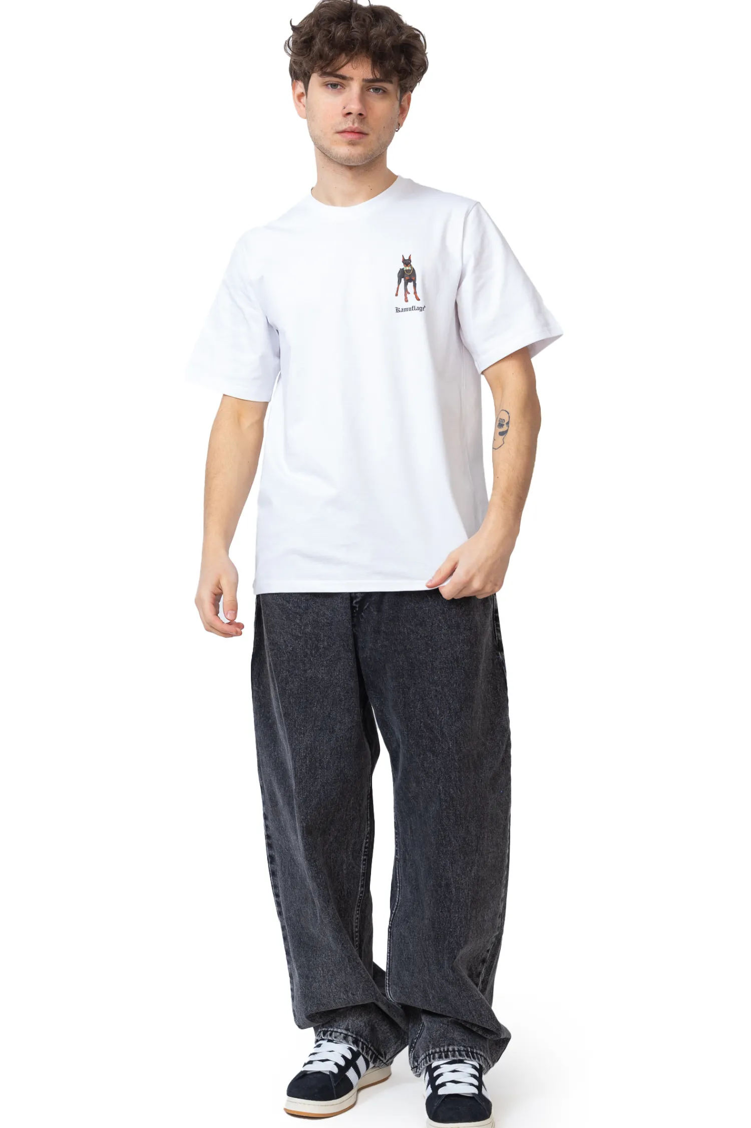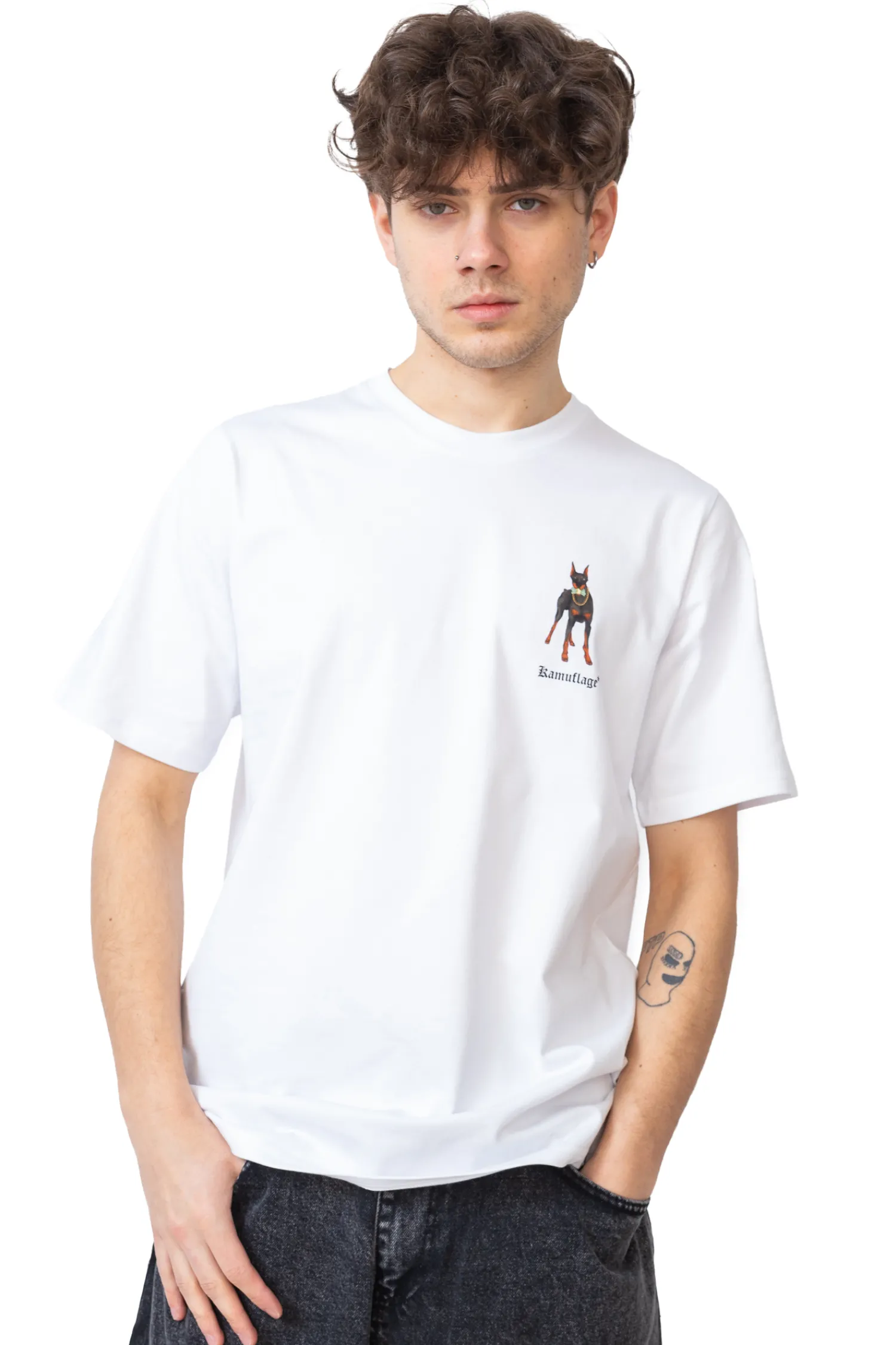 Koszulka Kamuflage DOBER$$$ White to stylowy T-shirt o luźnym kroju, wykonany z wysokiej jakości białej bawełny. Na plecach znajduje się wyrazista grafika przedstawiająca dwa dobermany – jeden z łańcuchem na szyi, drugi trzymający bukiet kwiatów, co tworzy kontrast między surowością a delikatnością. Unikalny design nadaje koszulce streetwearowego charakteru, idealnego dla fanów miejskiej mody.