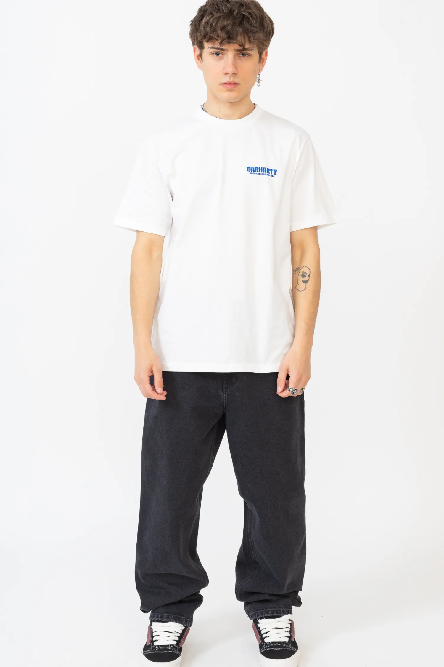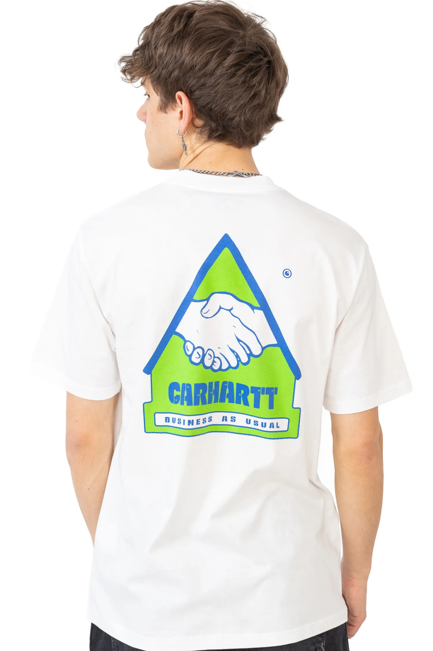 Koszulka Carhartt WIP Trade White I033638-02XX charakteryzuje się dużym, trójkątnym nadrukiem na tylnej stronie, przedstawiającym grafikę uścisku dłoni na zielonym tle. Nadruk zawiera nazwę marki 'Carhartt’ i hasło 'Business As Usual’ co nadaje koszulce charakterystycznego i oryginalnego wyglądu. Idealna dla miłośników streetwearu, koszulka Carhartt WIP łączy komfort noszenia z nowoczesnym designem.