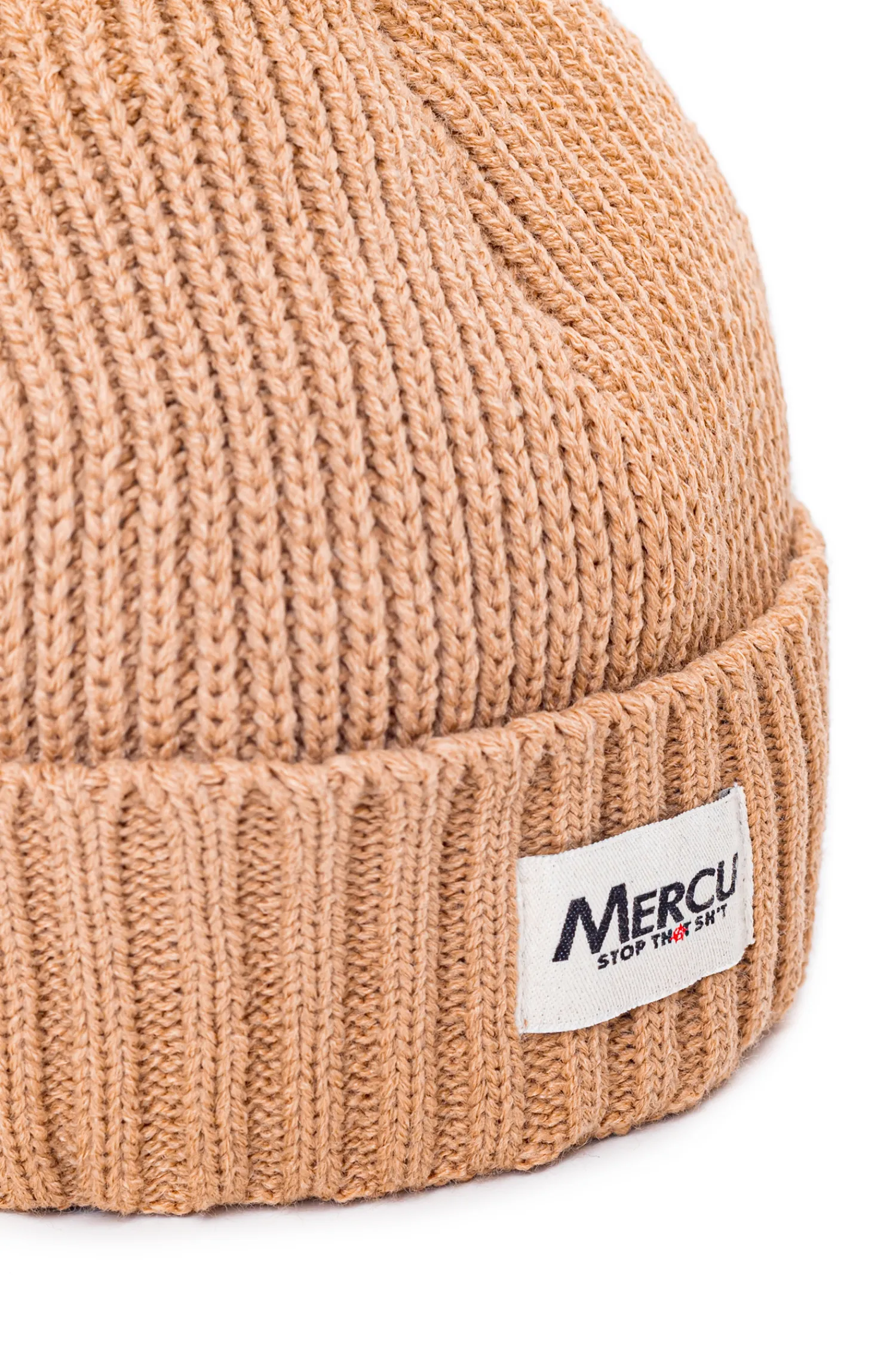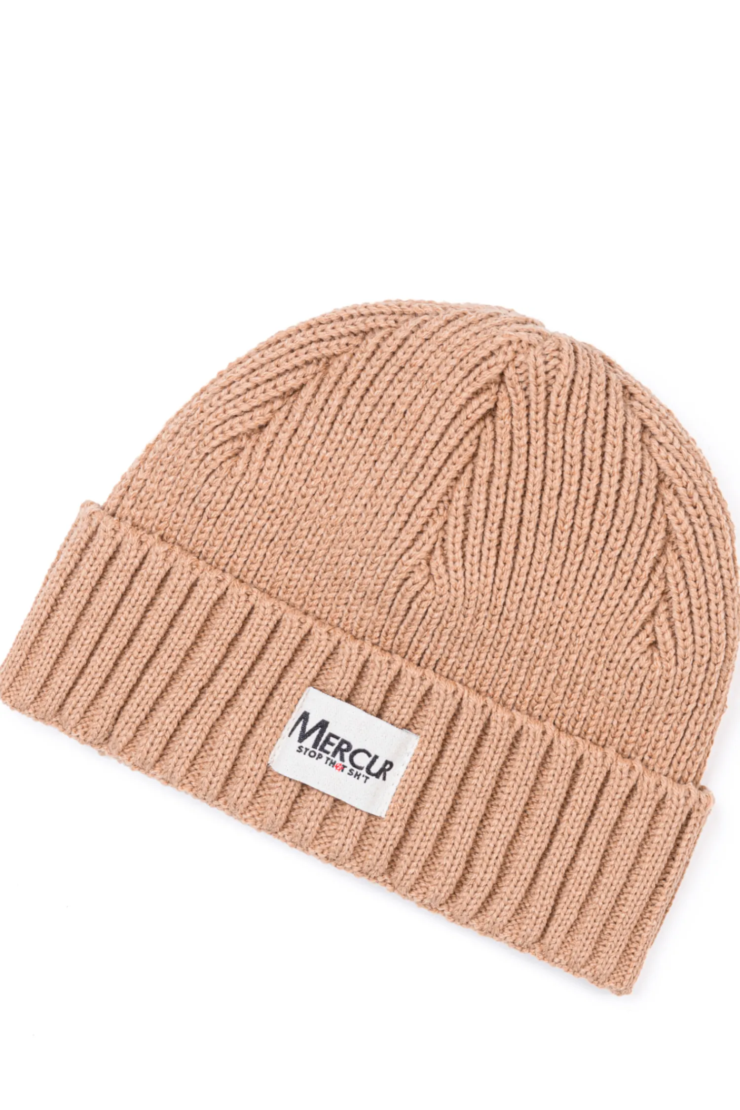Czapka zimowa Mercur, w kolorze beżowym, z żakardową metką z przodu.