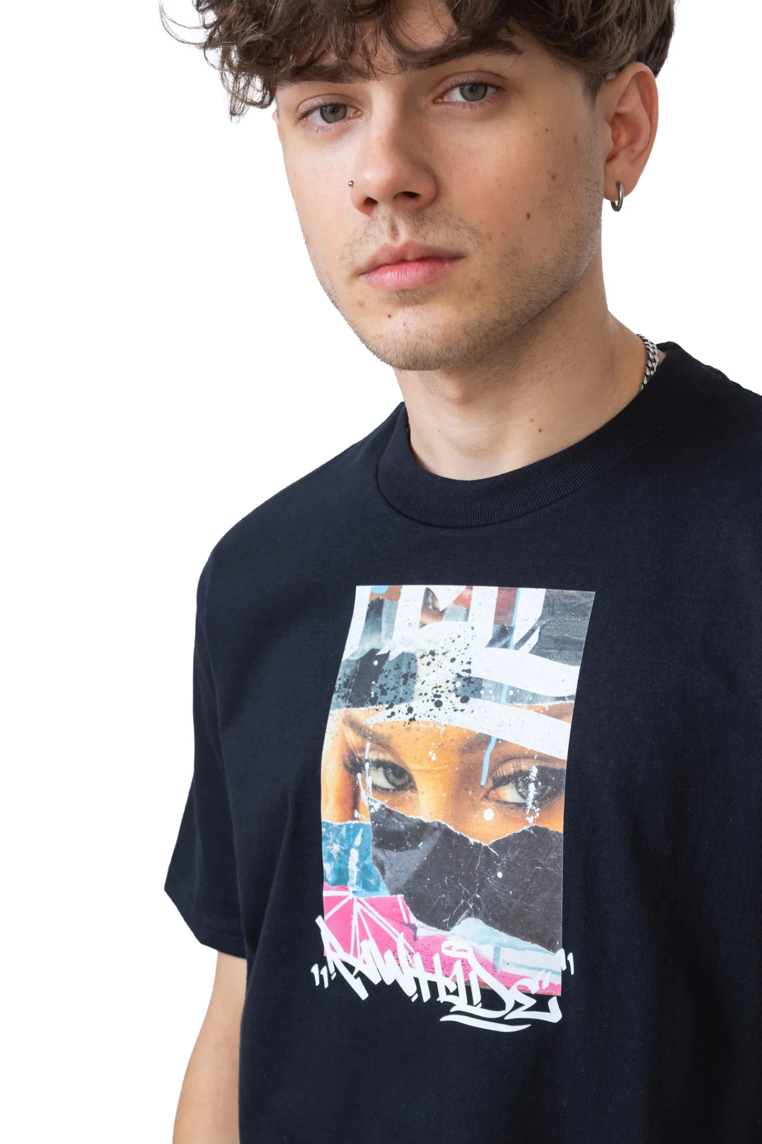 Koszulka Raw Hide Vision Black przyciąga wzrok odważnym, artystycznym nadrukiem z kolażem w klimacie street art. Czarne tło doskonale eksponuje grafikę, nadając całości mocnego, miejskiego charakteru. Wykonana z wysokiej jakości bawełny, zapewnia komfort noszenia i świetnie wpisuje się w stylizacje inspirowane kulturą uliczną.