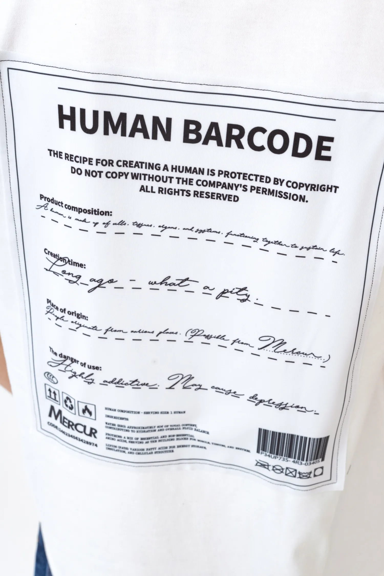 Koszulka Mercur Human White to elegancki i współczesny dodatek do ubioru, charakteryzujący się niepowtarzalnym wzorem. Centralnym elementem koszulki jest szeroki, prostokątny obszar z nadrukowanym kodem kreskowym i napisami, co stanowi kontrast z białym tłem tkaniny i skłania do przemyśleń. Wykonana z materiału najwyższej jakości, koszulka gwarantuje wygodę użytkowania i długotrwałość. Jest idealna dla tych, którzy szukają unikalnego designu oraz dla osób pragnących wyrażać swoje przekonania za pomocą stroju.