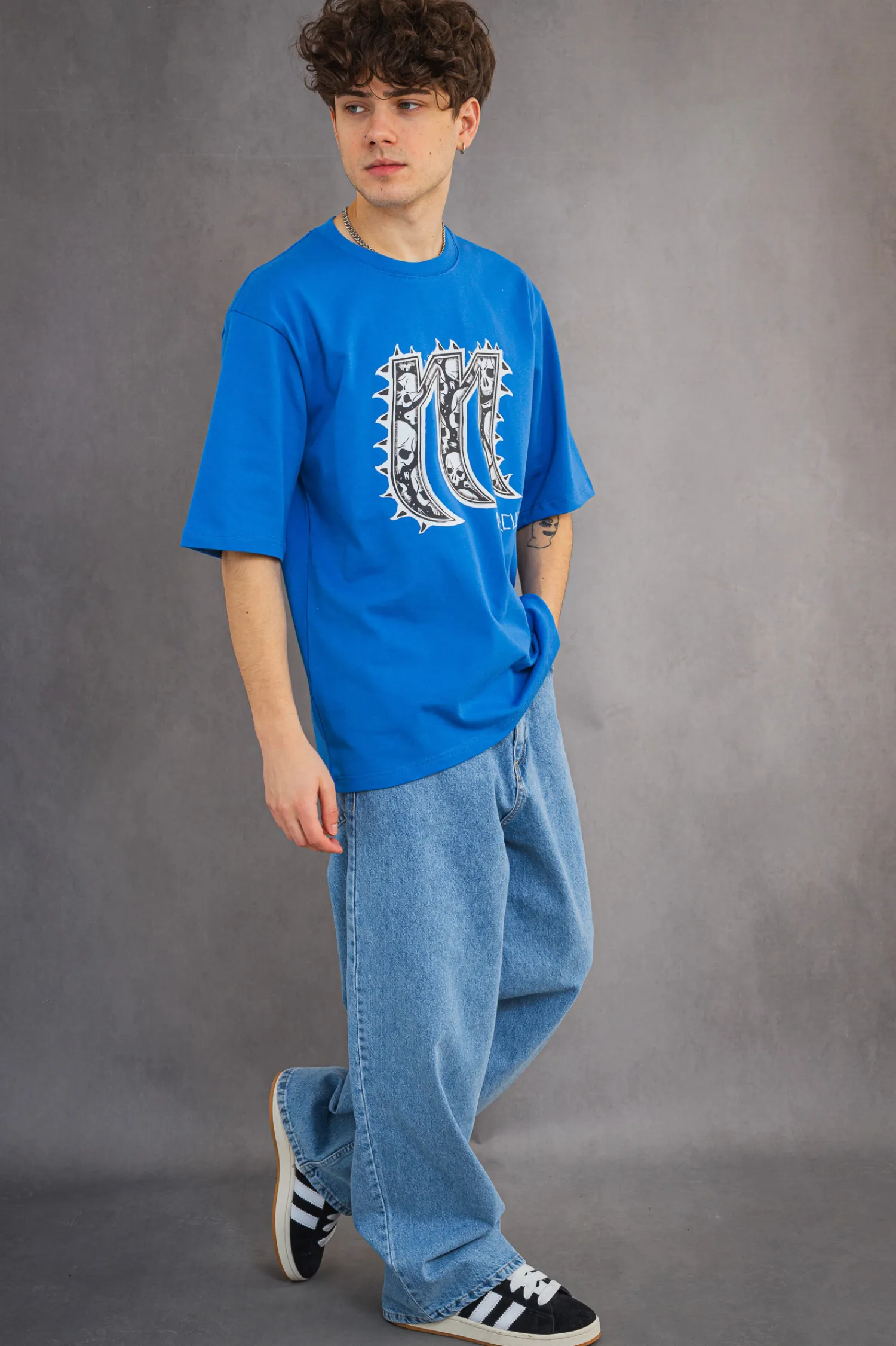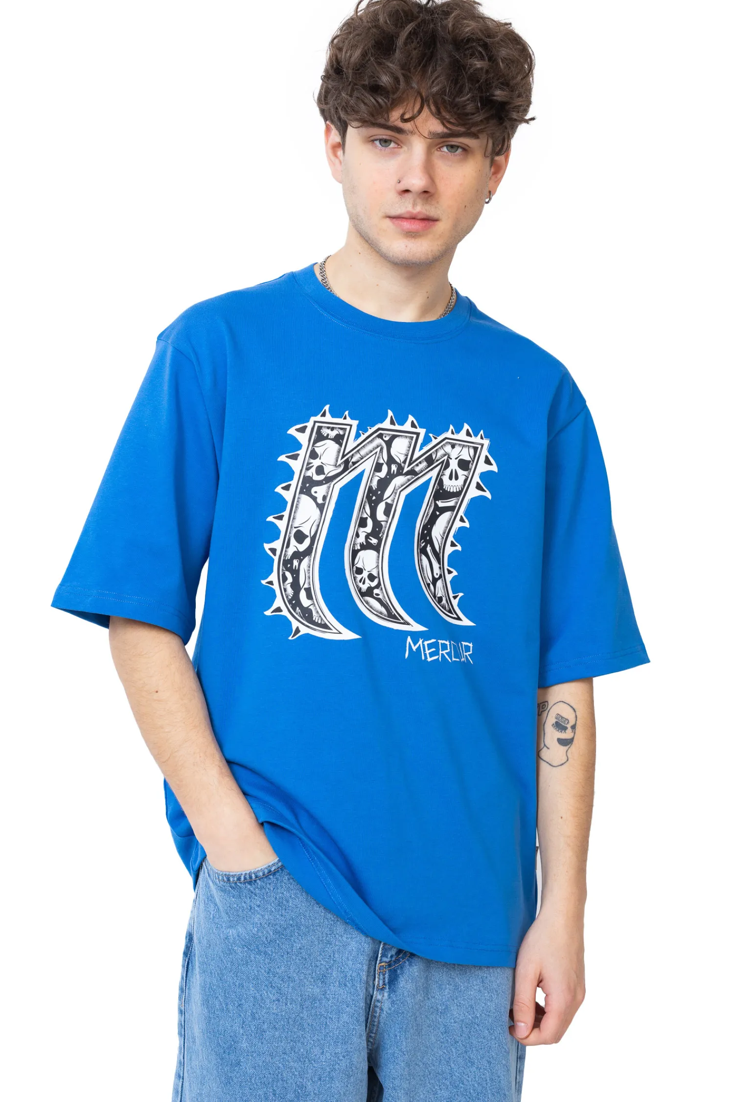 Koszulka Mercur Spike Blue to odważny, streetwearowy element garderoby, wyróżniający się grafiką litery „M”, otoczonej kolcami i wypełnionej motywem czaszek. Intensywny, niebieski kolor nadaje jej energii i sprawia, że świetnie komponuje się zarówno z jasnymi, jak i ciemnymi stylizacjami.