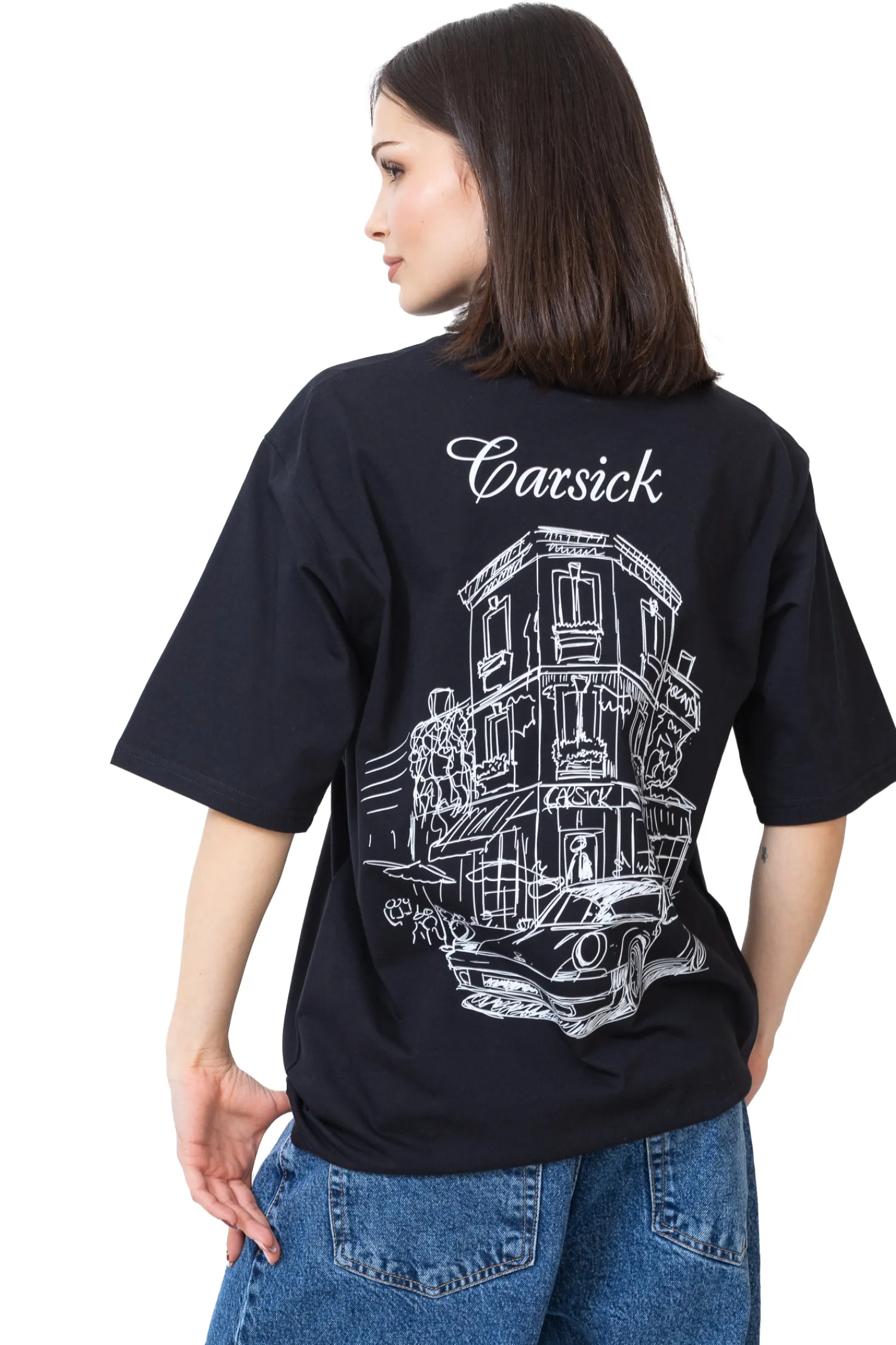 Koszulka Carsick CAFFÉ Black to połączenie artystycznej grafiki z motoryzacyjną zajawką. Na plecach znajduje się dopracowany szkic stylowego klasyka zaparkowanego pod klimatyczną kawiarnią, co nadaje całości niepowtarzalnego charakteru. Czarny kolor i wyrazista ilustracja czynią ten t-shirt idealnym wyborem dla fanów aut i stylu z klasą.