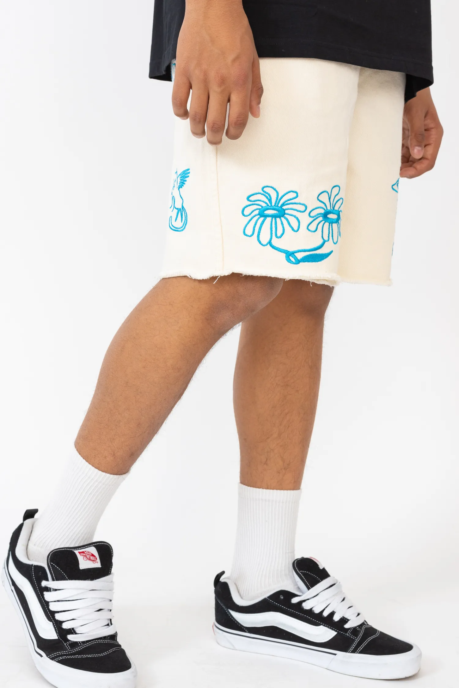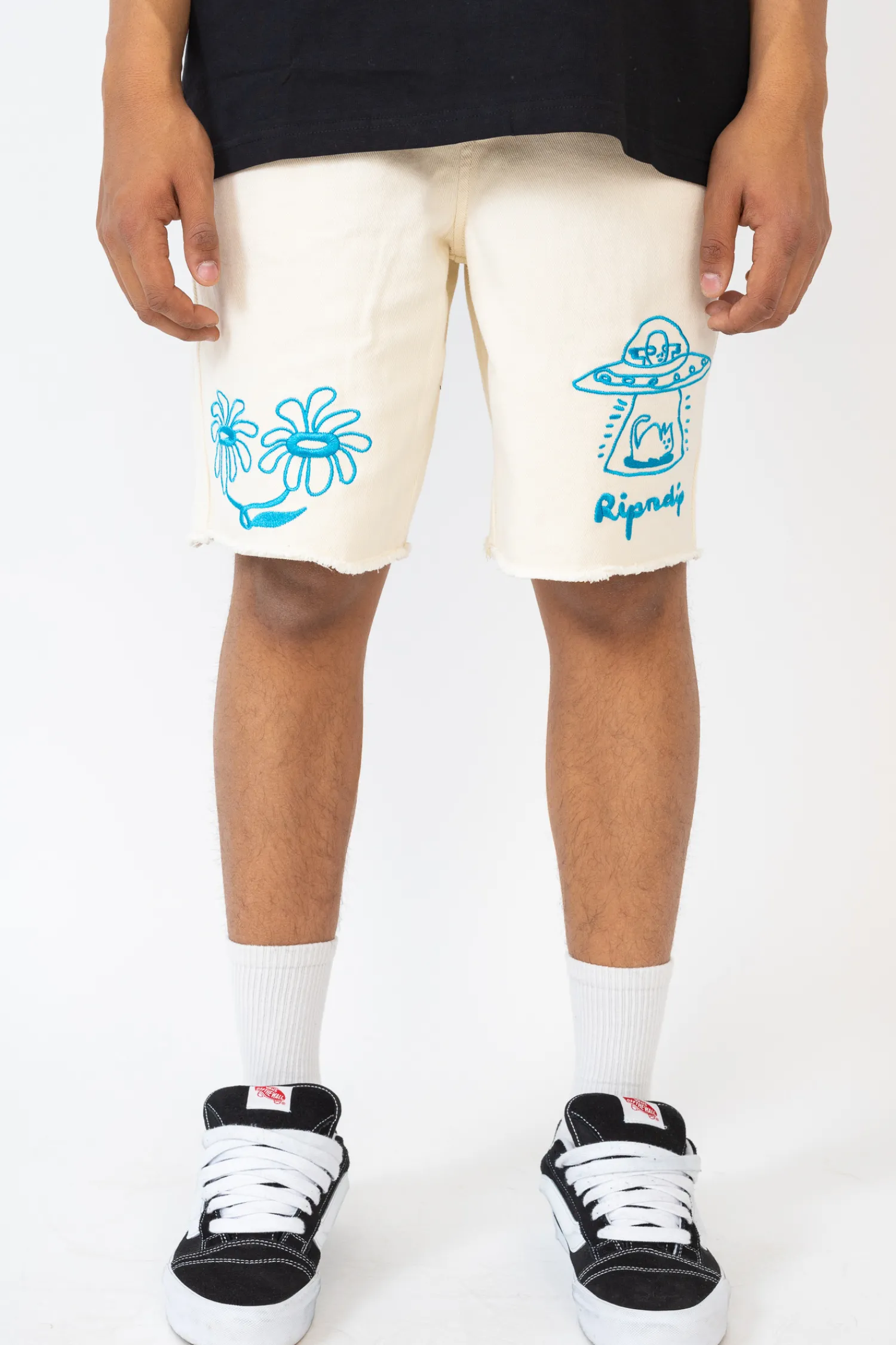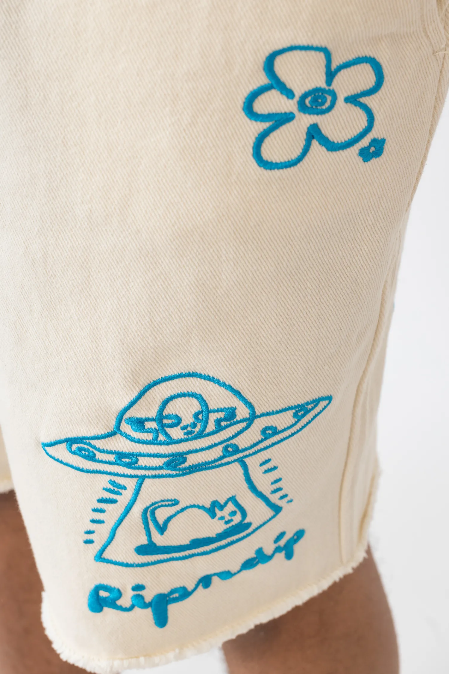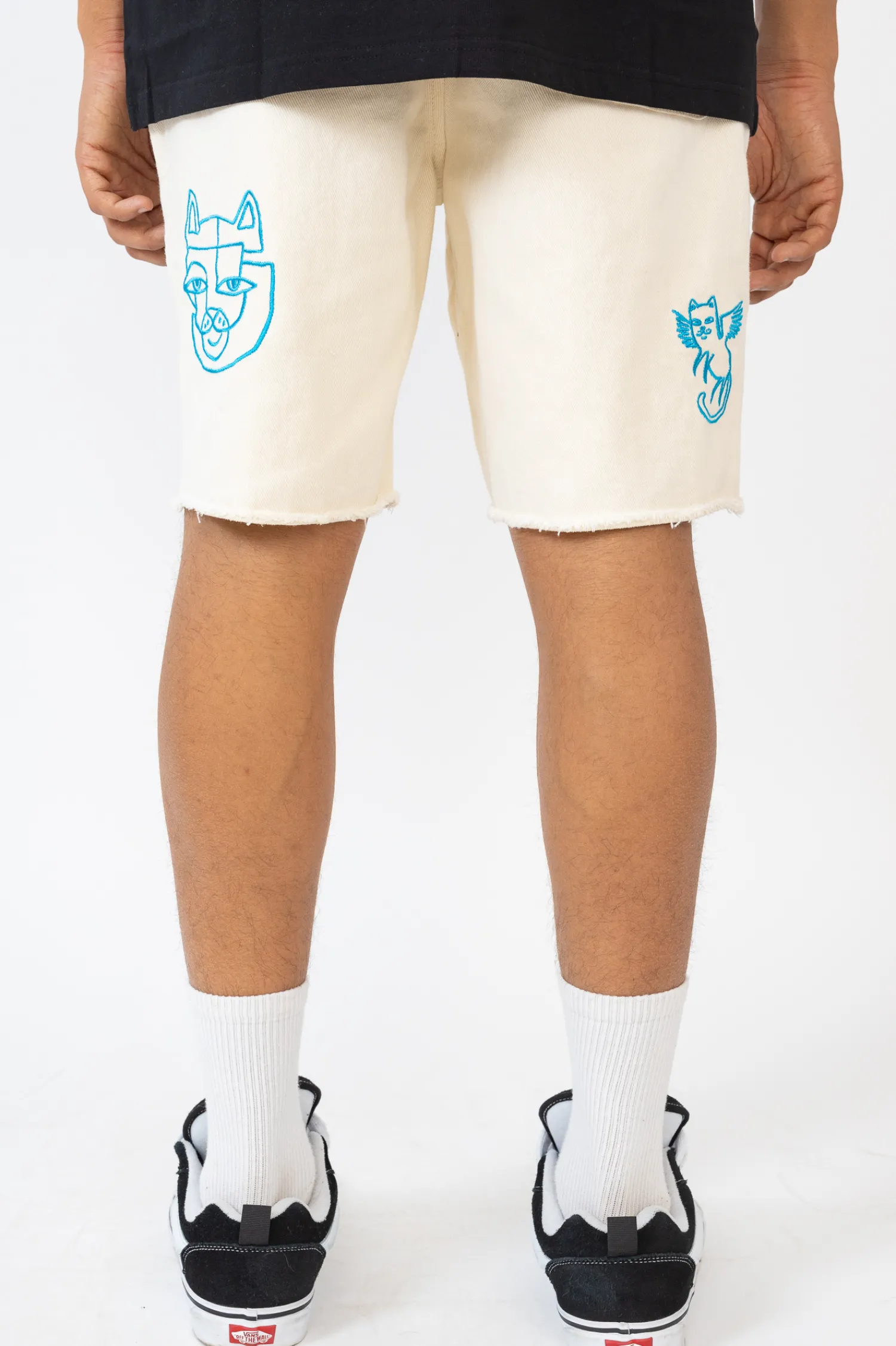 Szorty Ripndip Blonded Off White RNDSPR24127 prezentują się w jasnym, kremowym odcieniu, stanowiąc doskonałe tło dla wyrazistych, niebieskich haftów. Unikalny design zawiera zabawne grafiki, nadając szortom młodzieńczy i swobodny charakter. Logo marki Ripndip wyraźnie widnieje wśród grafik, podkreślając autentyczność produktu. Wykonane z wysokiej jakości materiałów, szorty gwarantują komfort i trwałość, zarówno na co dzień, jak i podczas letnich przygód. Ich odpowiedni krój zapewnia swobodę ruchów, a praktyczne kieszenie zwiększają funkcjonalność.