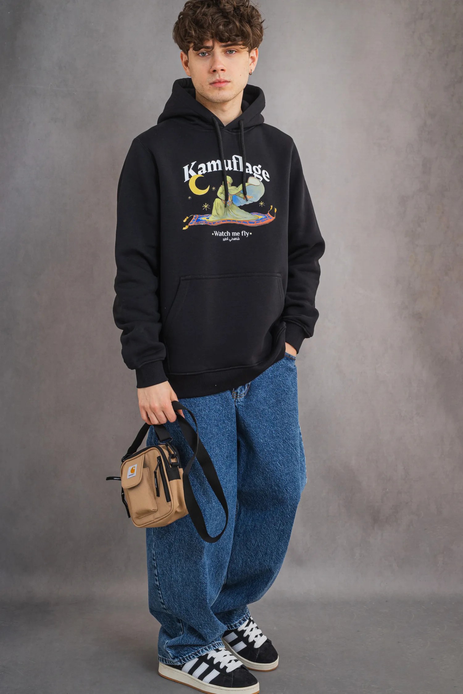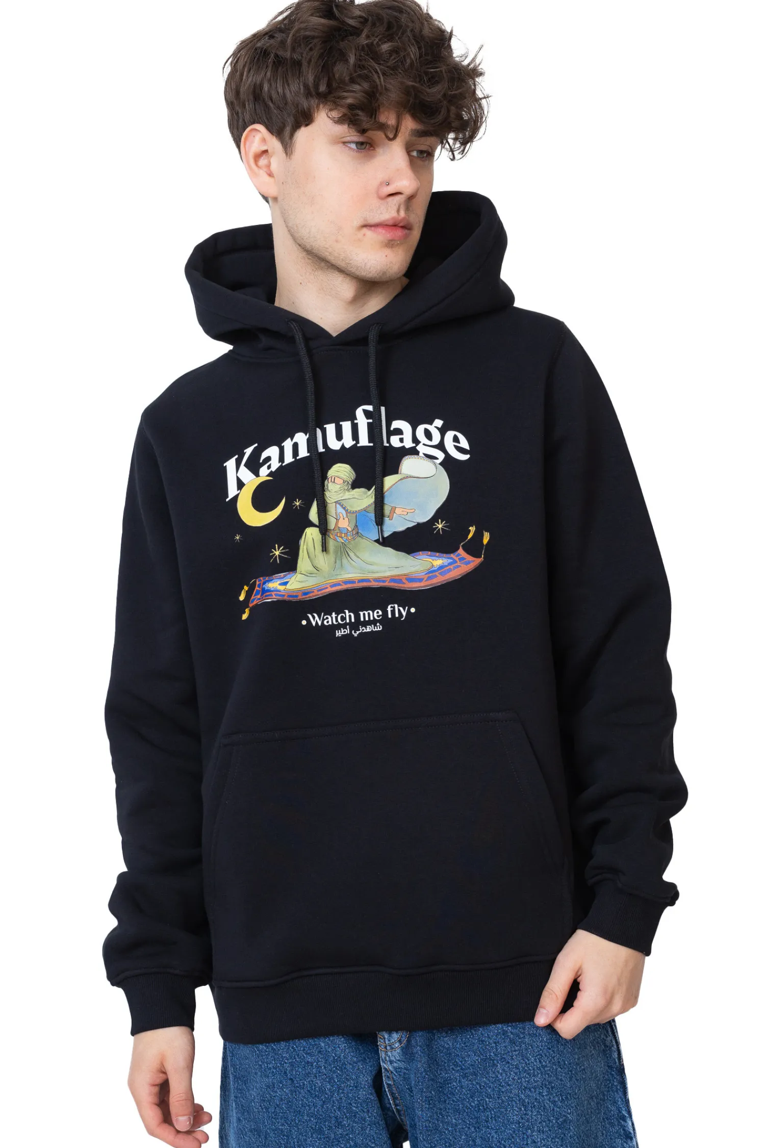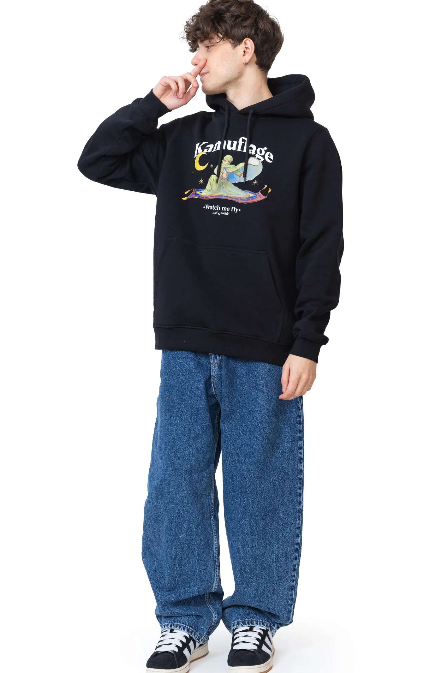 Bluza z kapturem Kamuflage Get High Black to oryginalna propozycja dla fanów streetwearu z nutą orientu i humoru. Na froncie znajduje się przyciągająca wzrok grafika z postacią na latającym dywanie oraz napis „Watch me fly”. Bluza wyposażona jest w klasyczny kaptur, kieszeń typu kangurka i elastyczne ściągacze, co zapewnia komfort i funkcjonalność na co dzień.