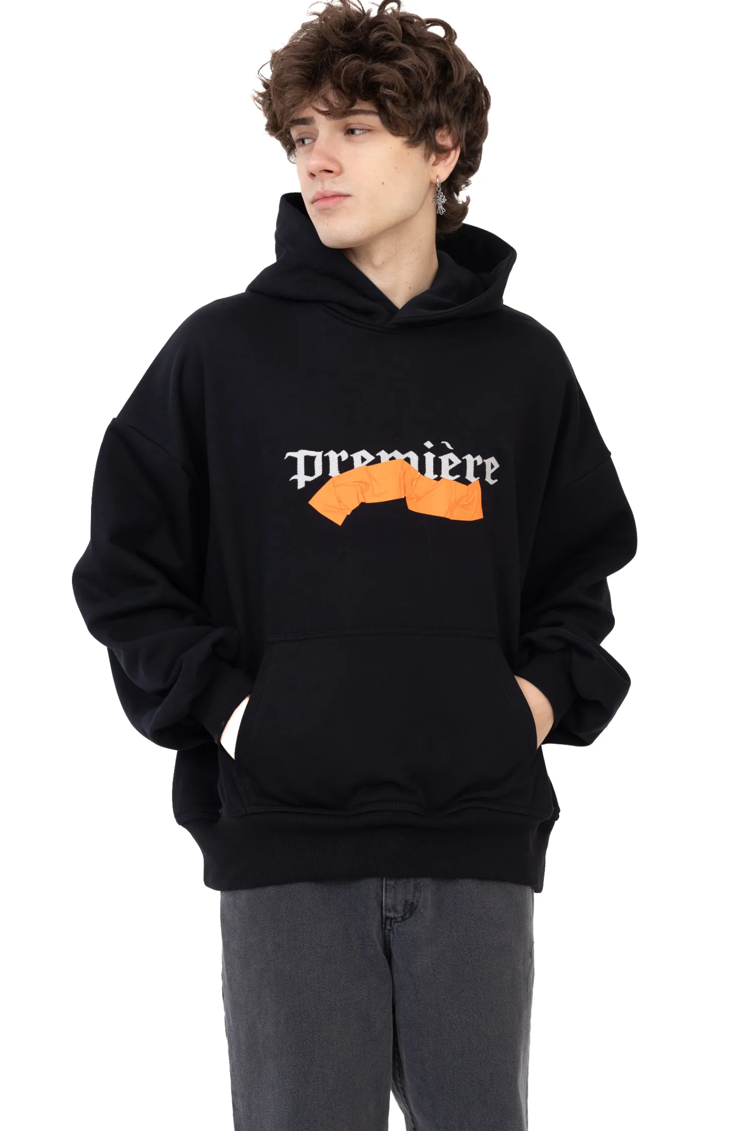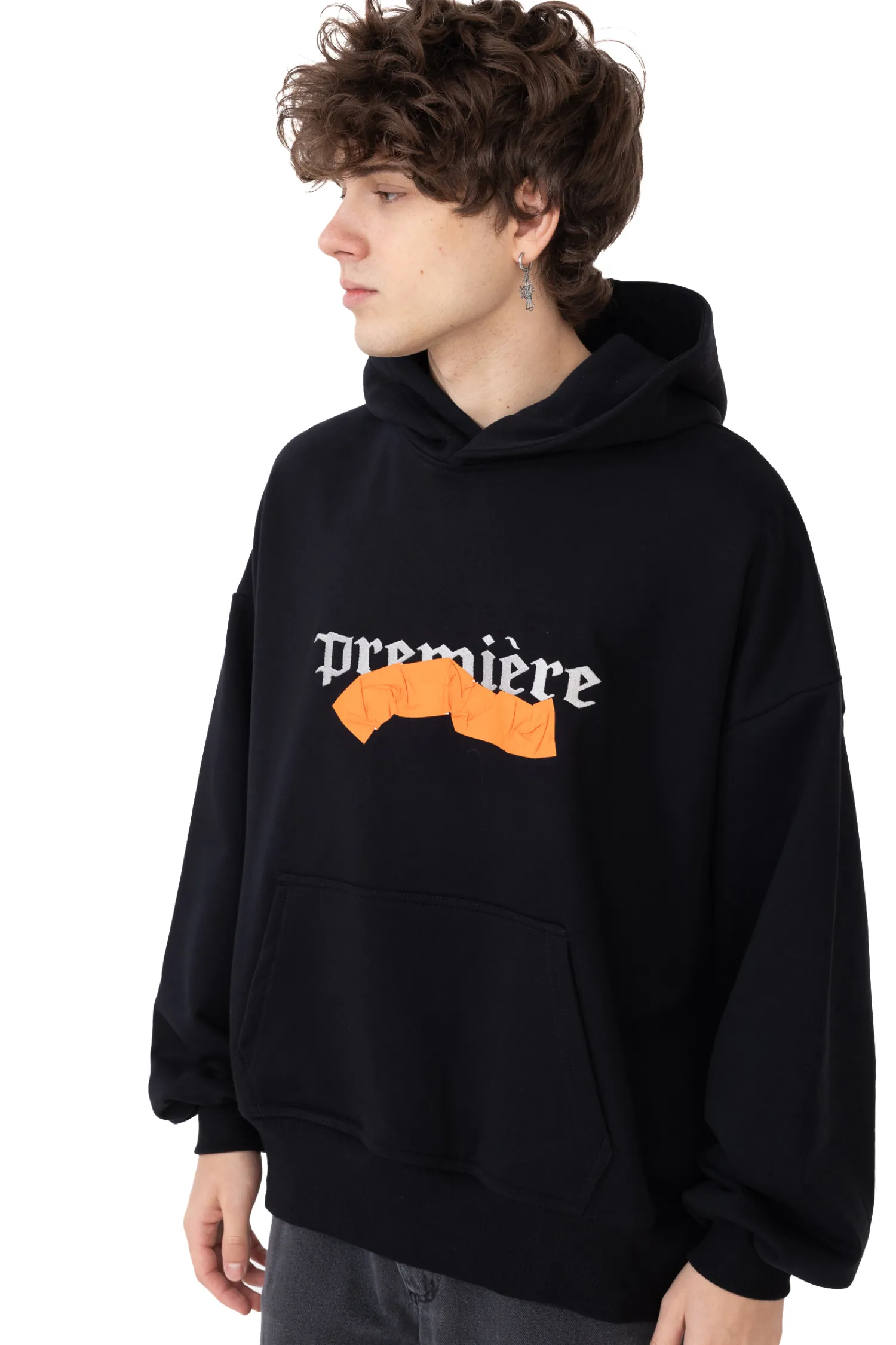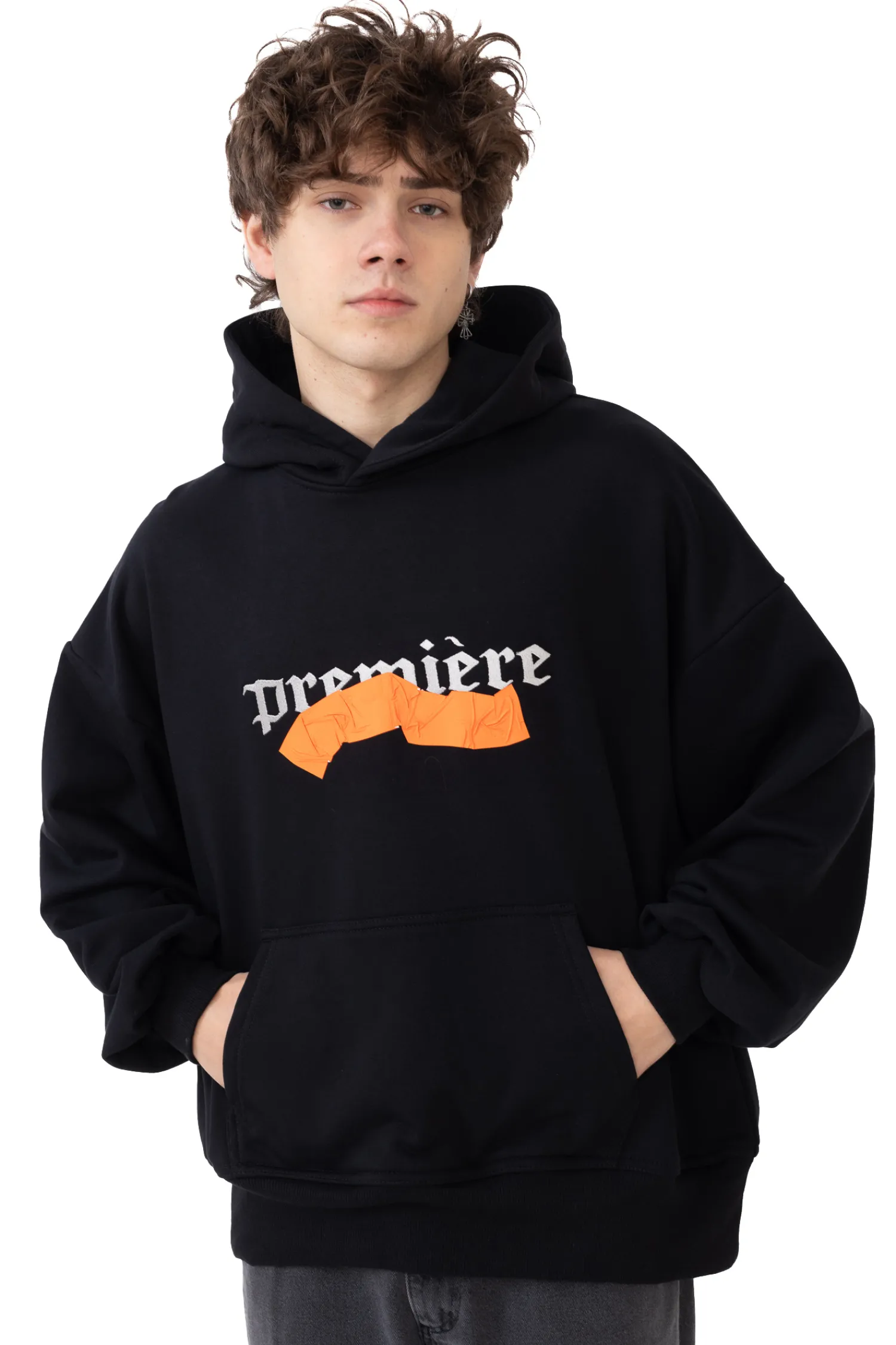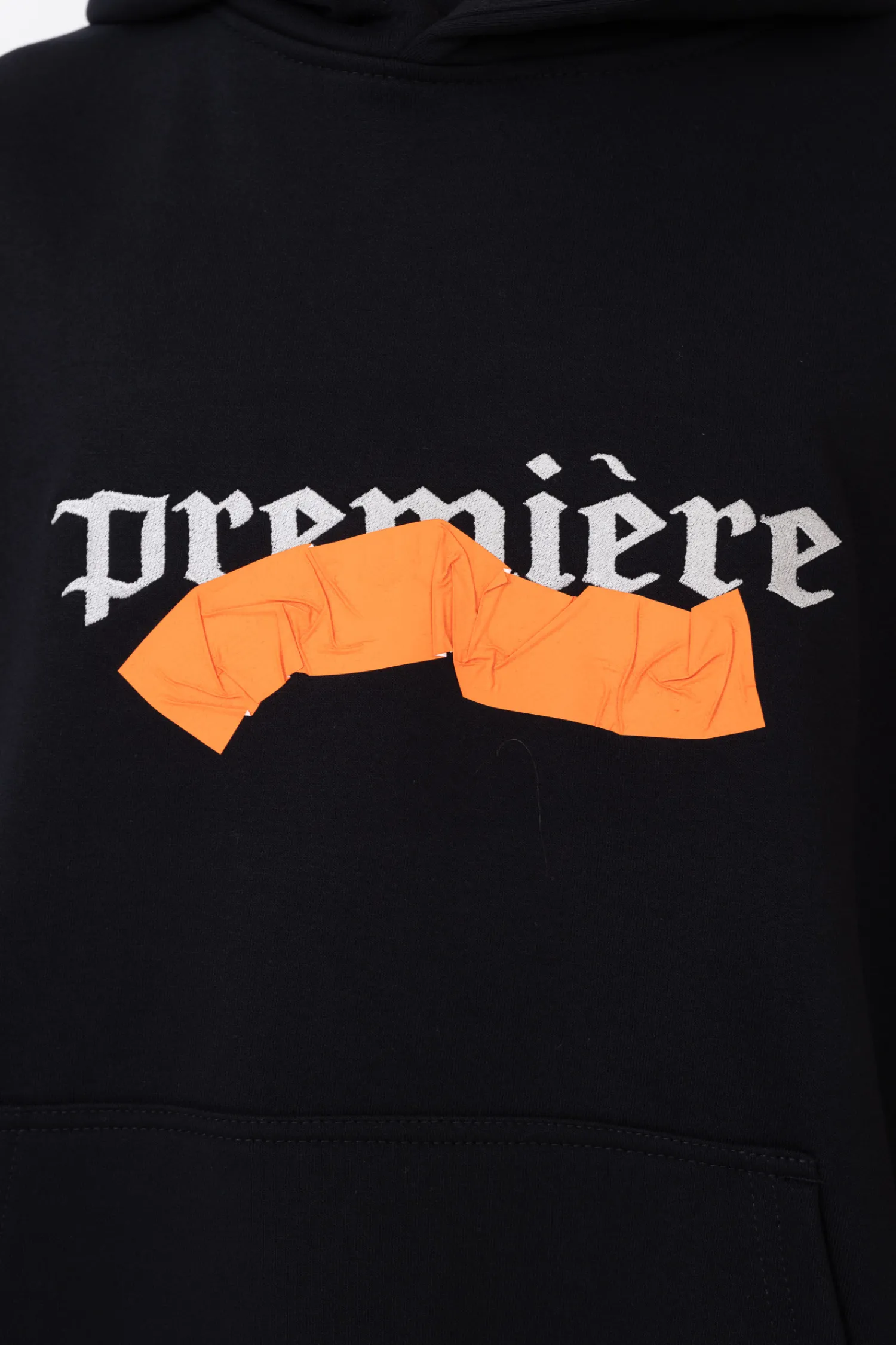 - Trwale przyklejona taśma i haftowany napis z przodu bluzy.