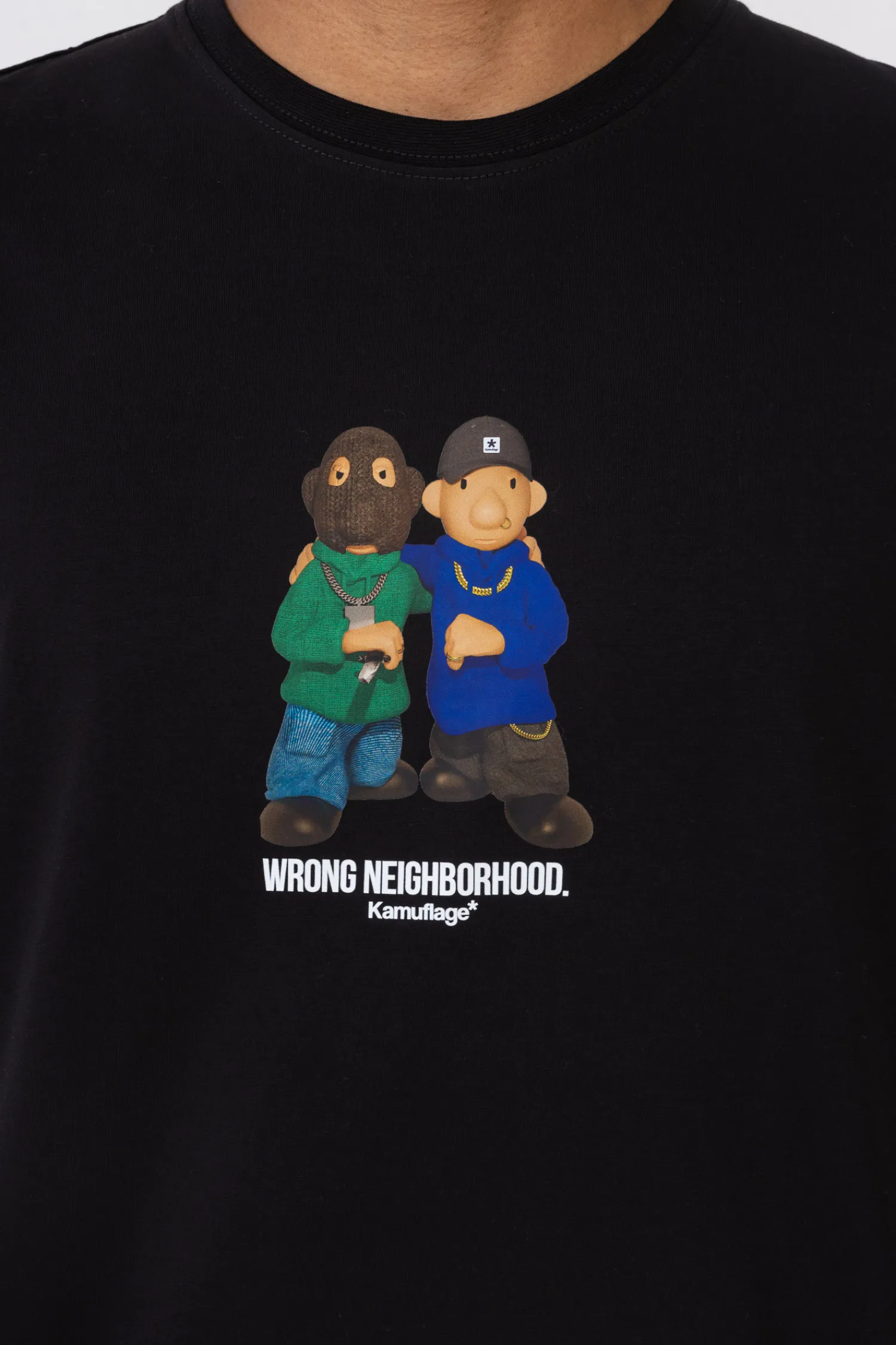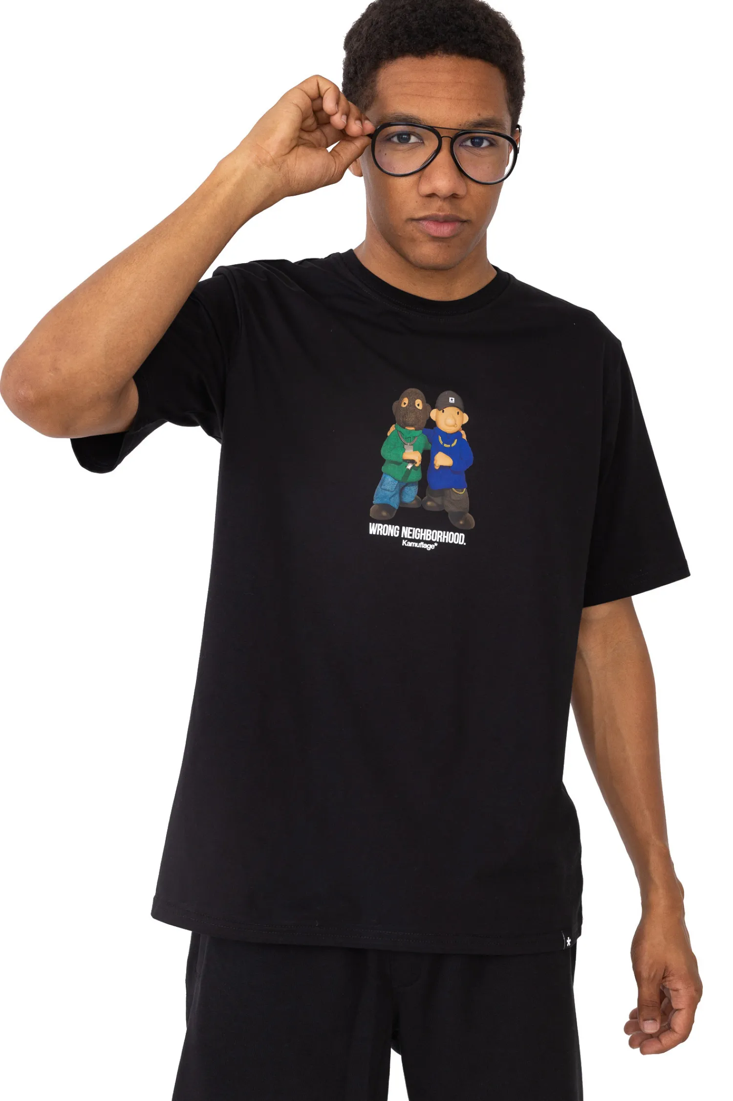 Koszulka Kamuflage Bad Neighbor Black to modny element garderoby, który wyróżnia się swoim unikalnym designem. Czarna koszulka o luźniejszym kroju została ozdobiona kolorową grafiką przedstawiającą dwie postacie. W dolnym rogu koszulki znajduje się małe logo marki Kamuflage. Całość prezentuje się nowocześnie i z pewnością przyciągnie uwagę miłośników miejskiego stylu. Koszulka ta jest idealna dla osób ceniących sobie oryginalność i wygodę, a także dla fanów mody ulicznej z nutą humoru i zadziorności.