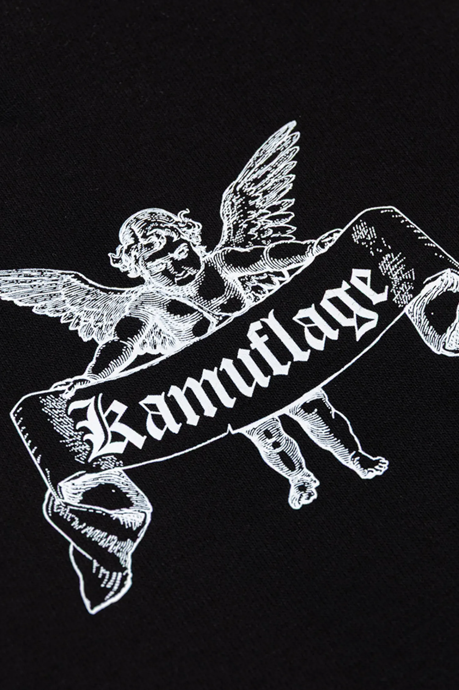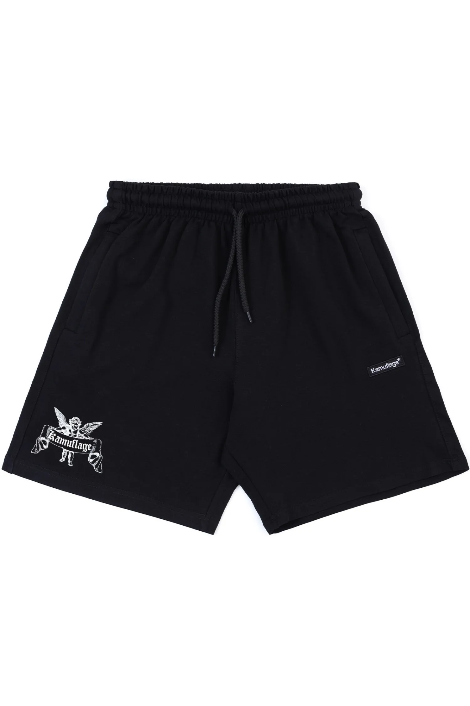 Szorty Kamuflage Hellfire Black to mocna propozycja dla fanów streetwearu z charakterem. Czarne, klasyczne tło kontrastuje z wyrazistym nadrukiem anioła trzymającego logo Kamuflage, dodając stylizacji unikalnego pazura. Wygodny krój, elastyczny pas i bawełniany materiał sprawiają, że to idealny wybór na miejskie lato i chill na pełnym luzie.